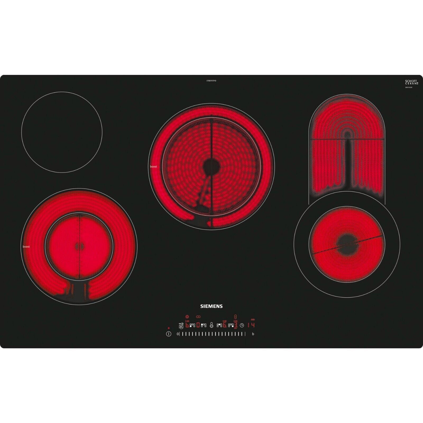 Produktbeschreibung Siemens ET 801FCP1D Elektrokochfeld Eigenschaften: Autarkes Elektrokochfeld aus Glaskeramik 17 Leistungsstufen Bedienung per touchSlider Timerfunktion und countDown-Funktion Sicherheitsabschaltung und Kindersicherung Zweistufige Restwärmeanzeige Lampe zeigt, an, ob das Kochfeld n