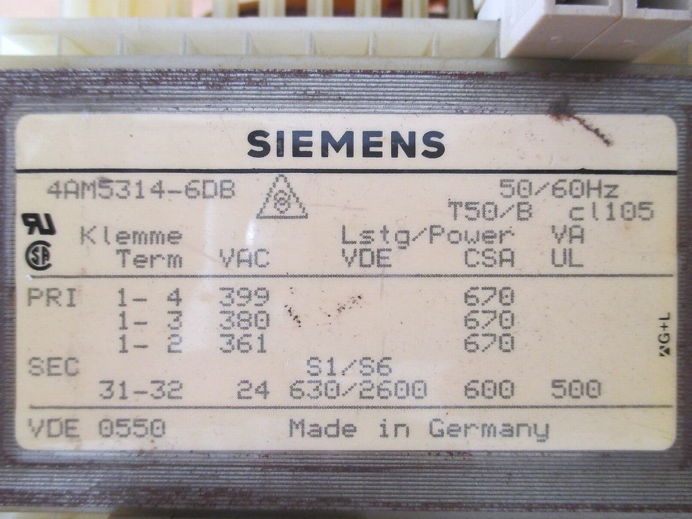 KOST-EX Elektrofachhandel Bestellnummer T 9 695 Siemens Transformator 4AM5314 - 6DB Sicherheitstrenntrafo Trafo 500 VA pri. 399 380 361 V sec. 24 V Maße L x B x H: 110 x 115 x 140 mm Gewicht: 7,6 kg Hergestellt nach VDE 0550 Sicherheitsprüfung nach VDE durchgeführt Der Trafo ist gebraucht. Unsere Ar
