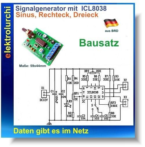 Sie bieten hier auf folgenden Artikel 1 Stück Signalgenerator Sinus Rechteck Dreieck Bausatz mit ICL8038 Generiert Sinus, Rechteck und Dreieck Wellen Sie kaufen einen Bausatz. Das heisst, sie müssen die Bauteile selbst auf die Platine löten. Dazu sind ein paar Grundkentnisse der Elektronik notwendig