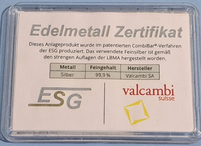 50 gr.Silberbarren valcambi schweitz neu Mit Echtheitszertifikat. In einer Münzbox 8x5 cm. Wird per Einschreiben versendet