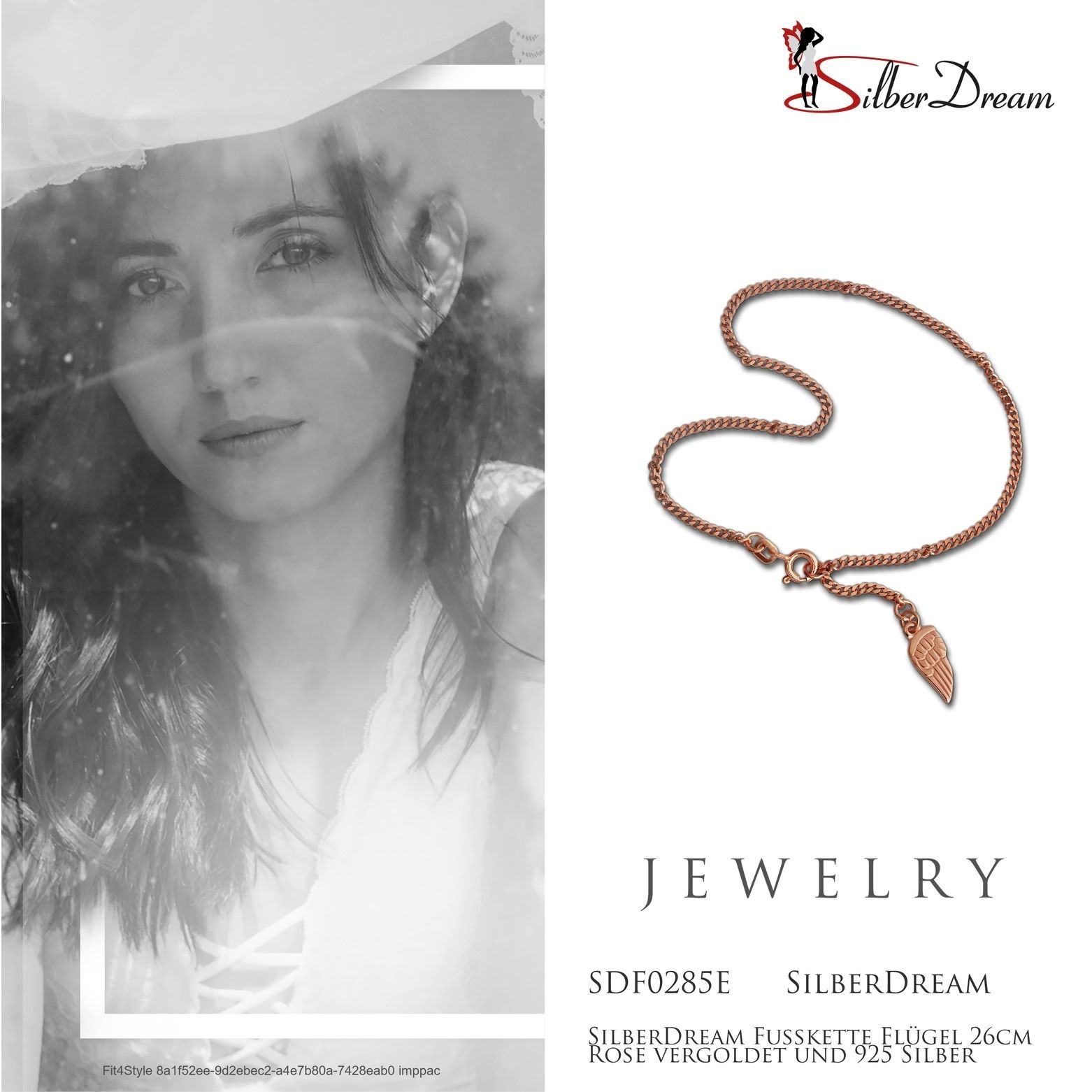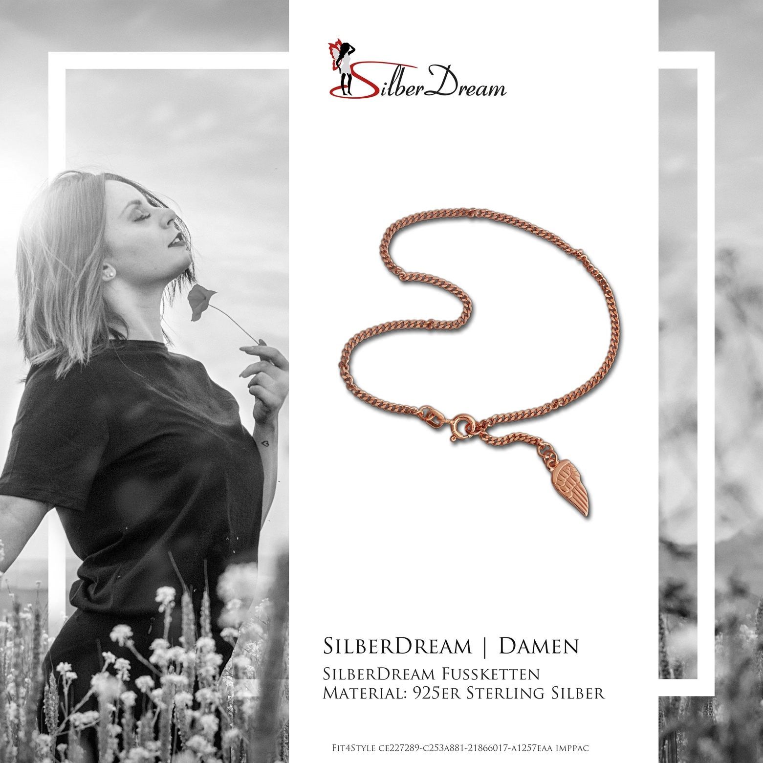 Eine SilberDream Marken-Fußketten Flügel mit der Bestellnummer SDF0285E für Damen in der Farbe rose. Der Fußschmuck aus der SilberDream Kollektion ist aus 925 Sterling Silber vergoldet Roségold 333 und hat einen Karabiner kann man bei ca. 23cm und 26cm einhängen-Verschluss.
