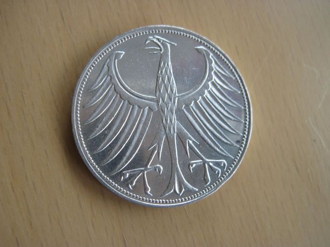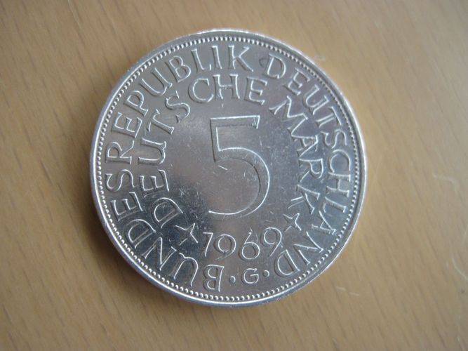 5 DM 1969 G Silberadler Erhaltung siehe Fotos Bundesrepublik Deutschland 5 DM Silber-Kursmünze Metall: Silber 625er Prägejahr: 1969 Durchmesser: 29 mm Münzstätte: G = Karlsruhe Vorderseite: Wert Rückseite: Bundesadler Rand: Einigkeit und Recht und Freiheit Erhaltung: siehe Fotos, die abgebildete Mün