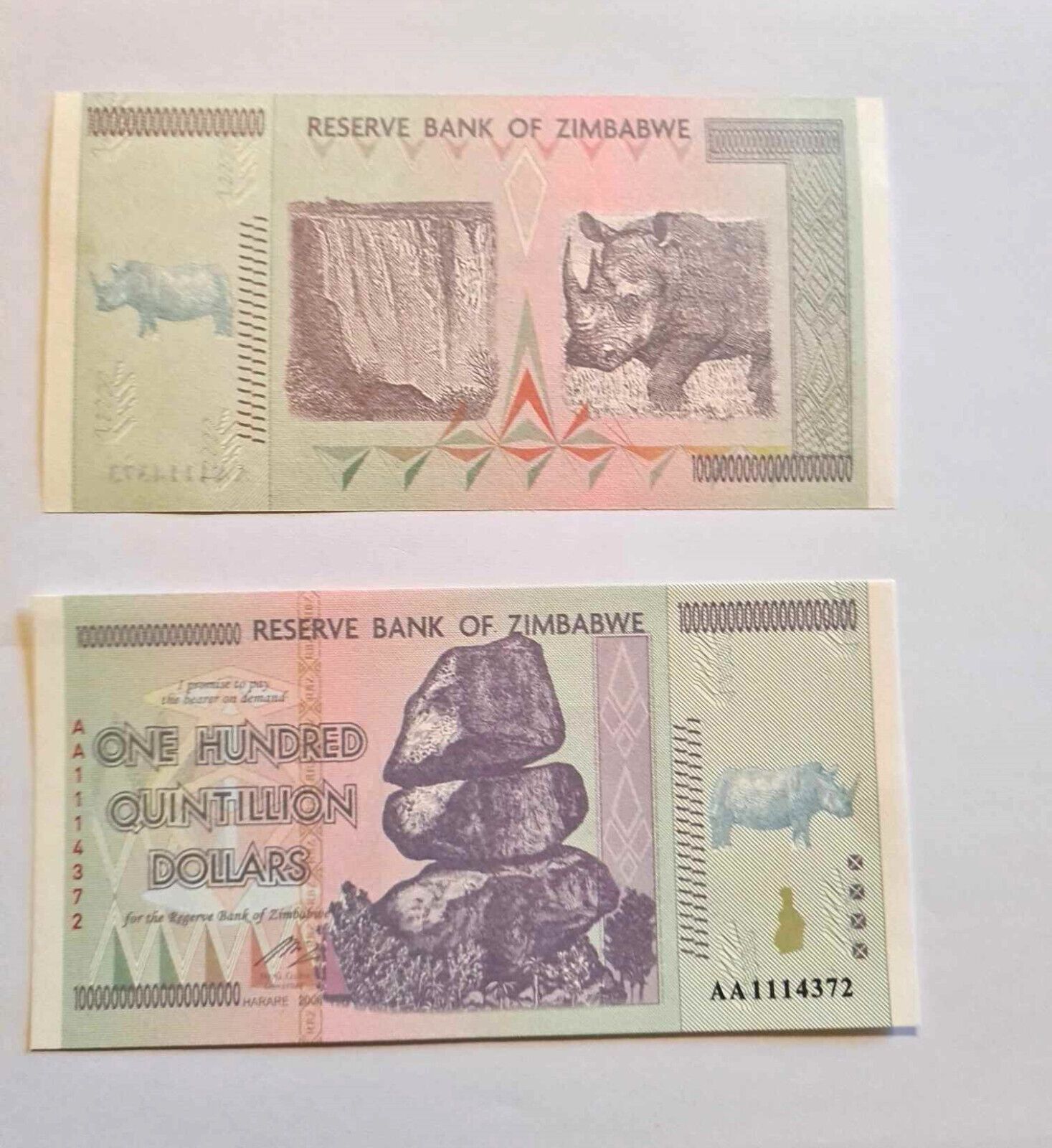 Diese Auflistung ist für eine extra feine $ 2 x Quintillion Dollar 2008 (1 x blaue und 1 x grüne Version) Keine fortlaufenden Seriennummern Simbabwe Dollar aus dem Jahr 2008. Diese Quintillion Dollars Simbabwe 2008 Note war ein Teil der Serie der 2008 2009-Inflationswährung, die zur Z . führte. Die