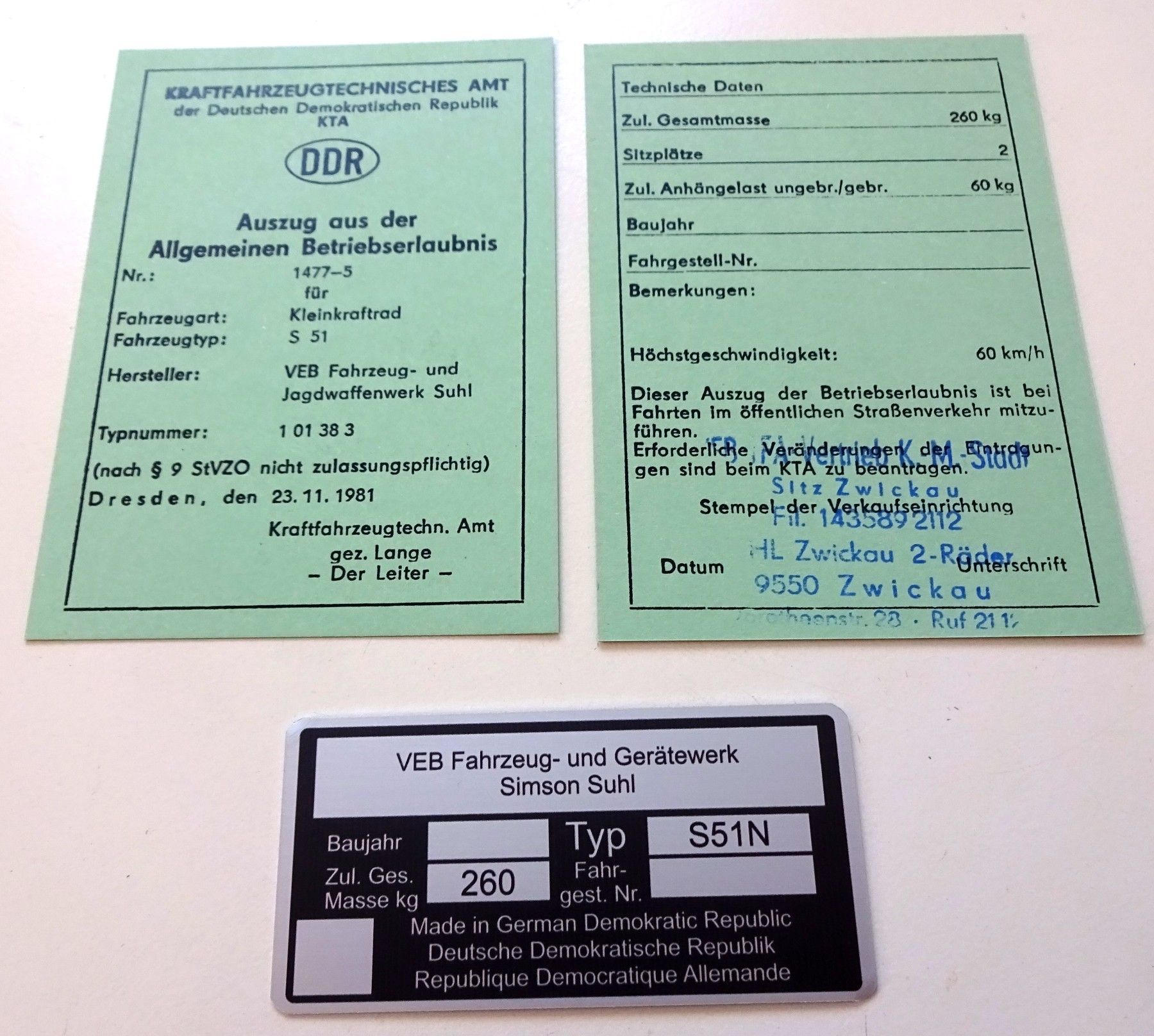 Simson S51 / N Datenblatt Betriebserlaubnis ABE und Typenschild
