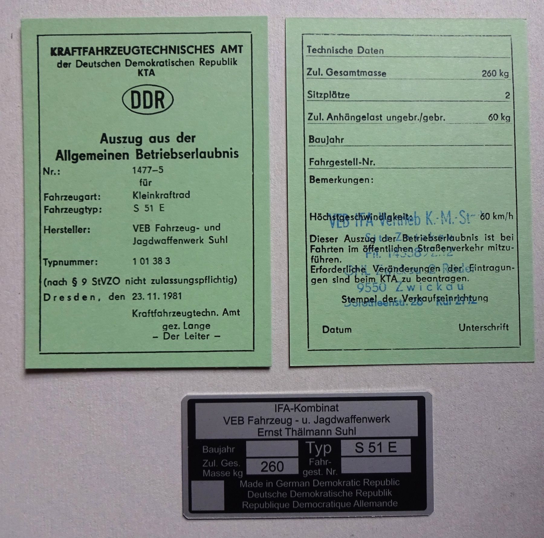 Simson S51E Datenblatt Betriebserlaubnis ABE und Typenschild