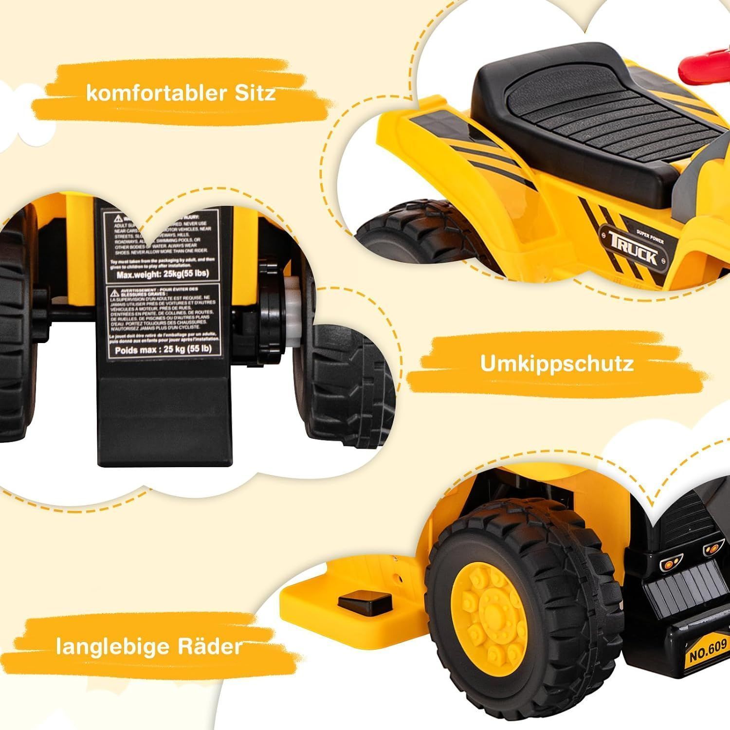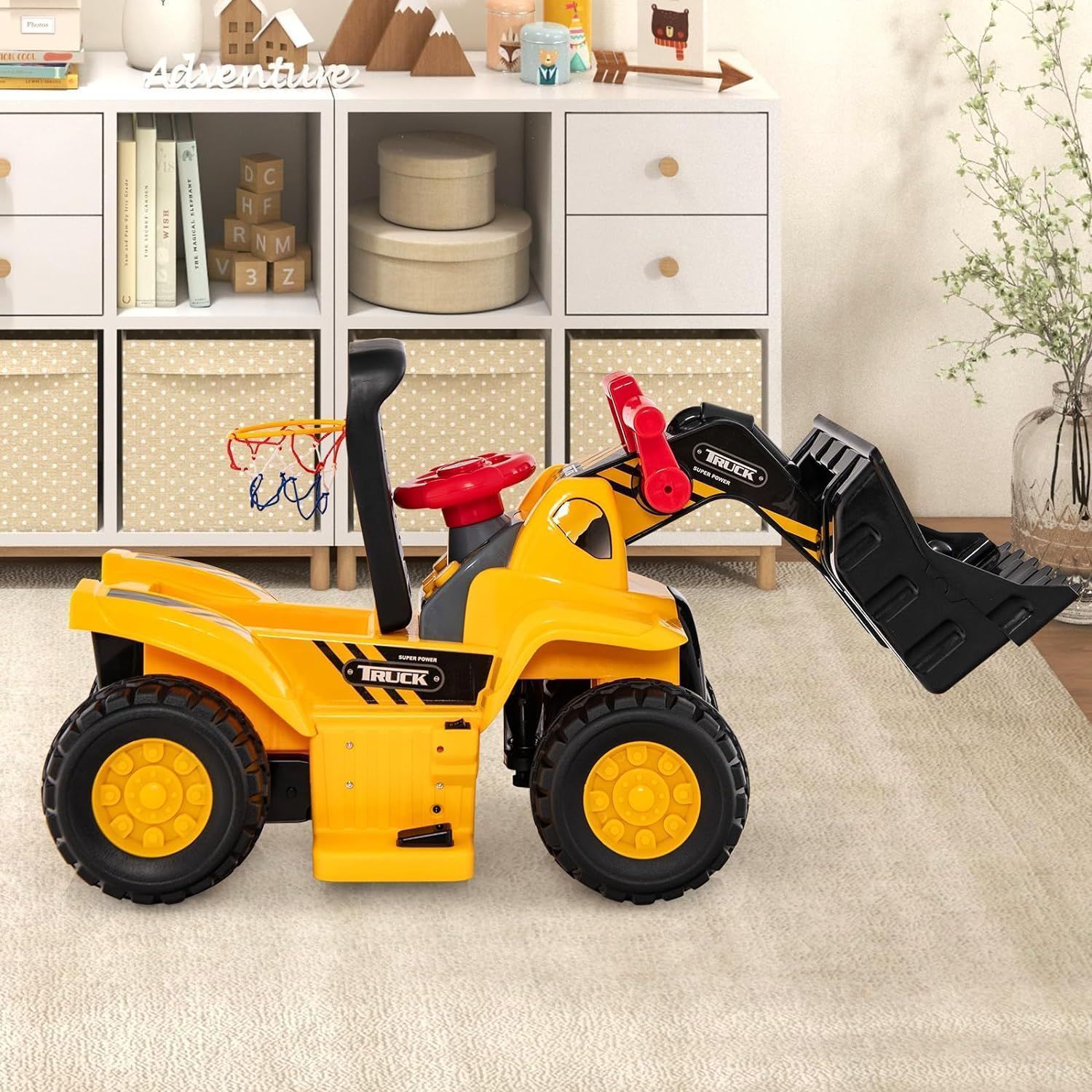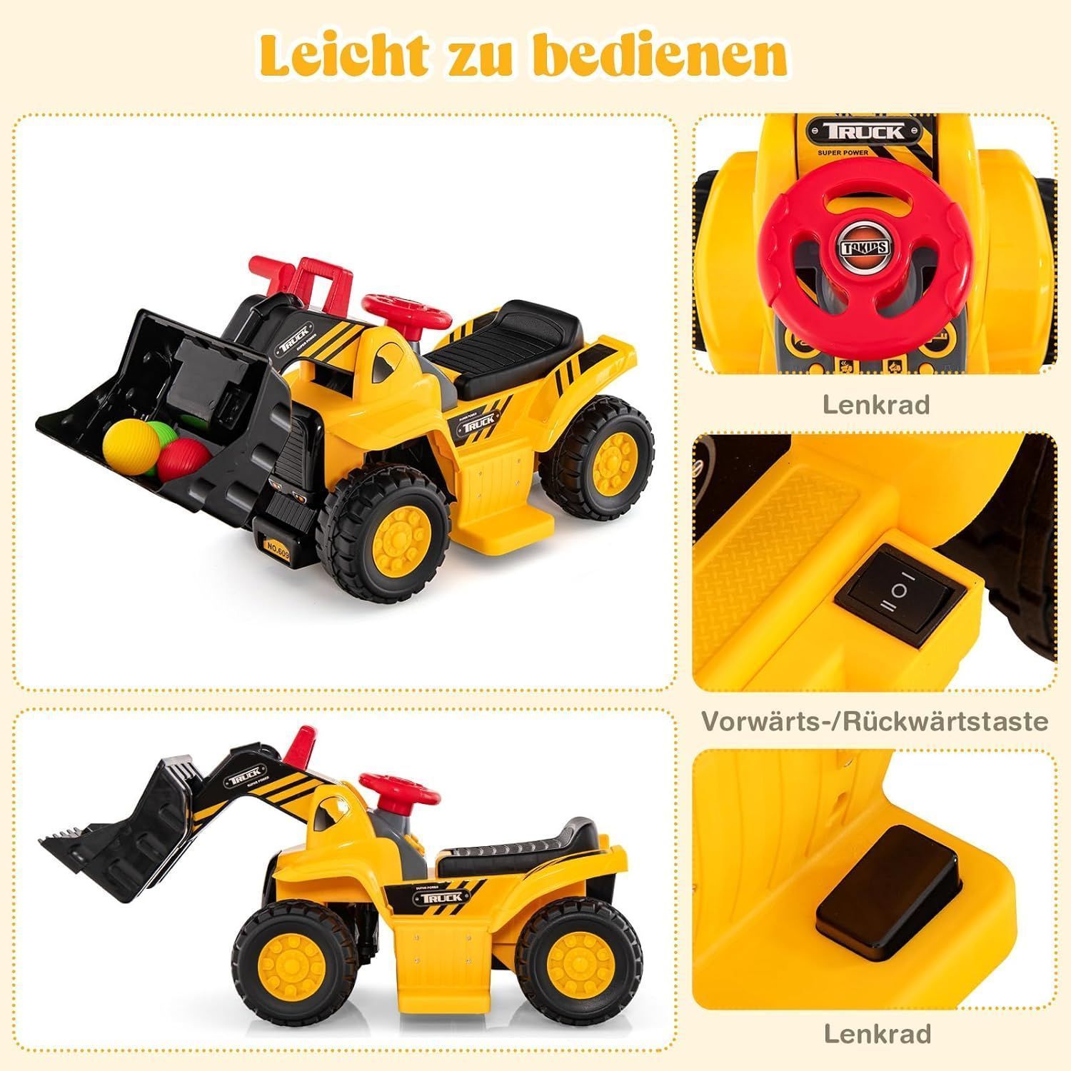Sitzbagger, Kinderbagger elektrisch mit verstecktem Stauraum & Basketballkorb