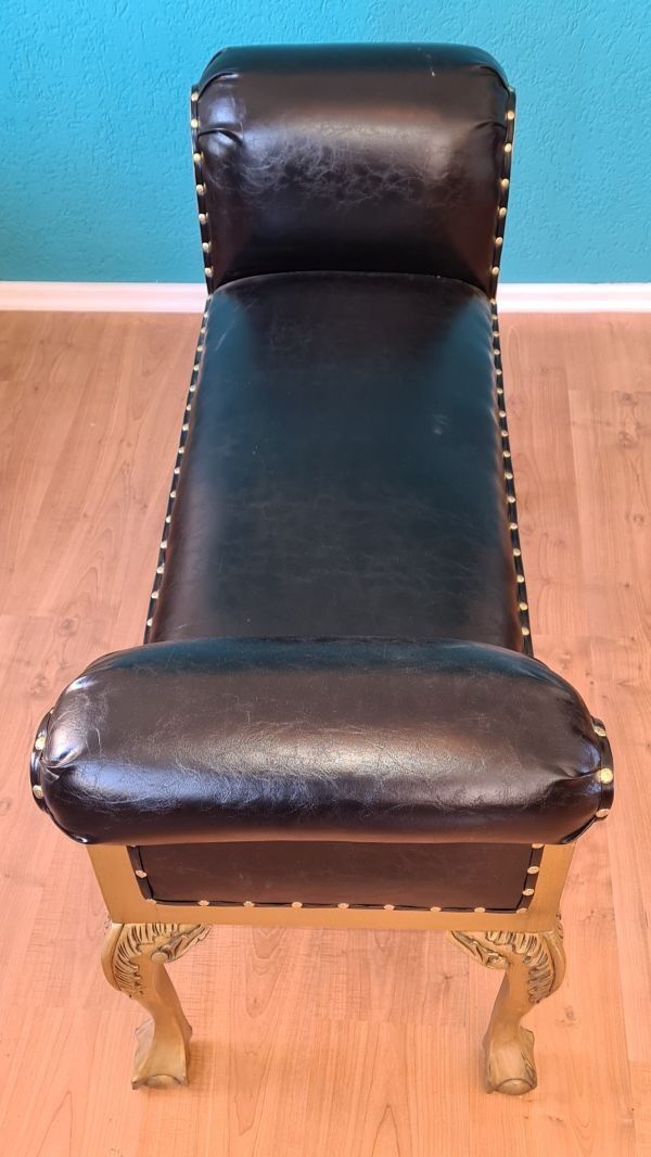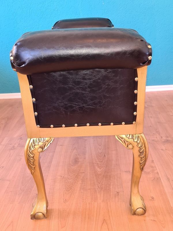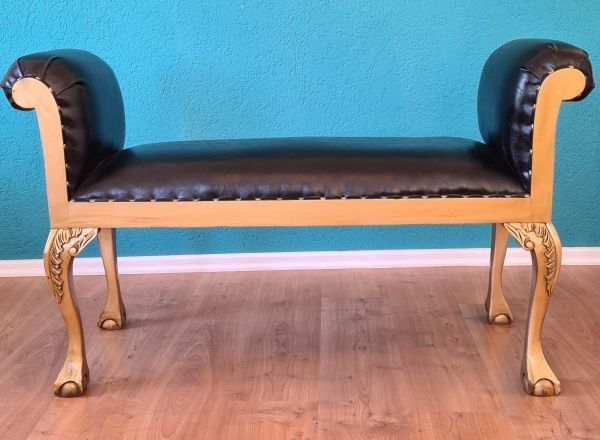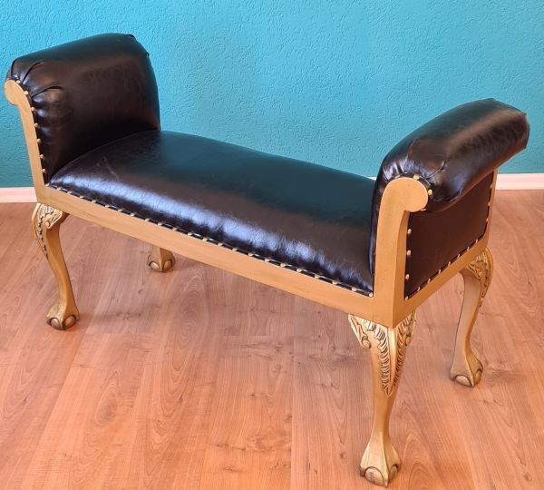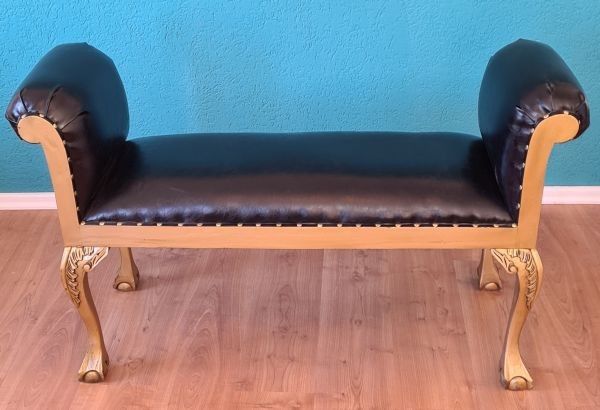 Nehmen Sie Platz, auf dieser stilvollen Sitzbank, und Sie werden sich wohlfühlen. Sehr wirkungsvoll ist das Aussehen, dieser prachtvollen Sitzbank, die im Chippendale Stil gehalten wurde. Das bequeme Polster hat einen schwarzen, lederartigen Bezug und ist mit Ziernägel eingefaßt. Hergestellt wurde d