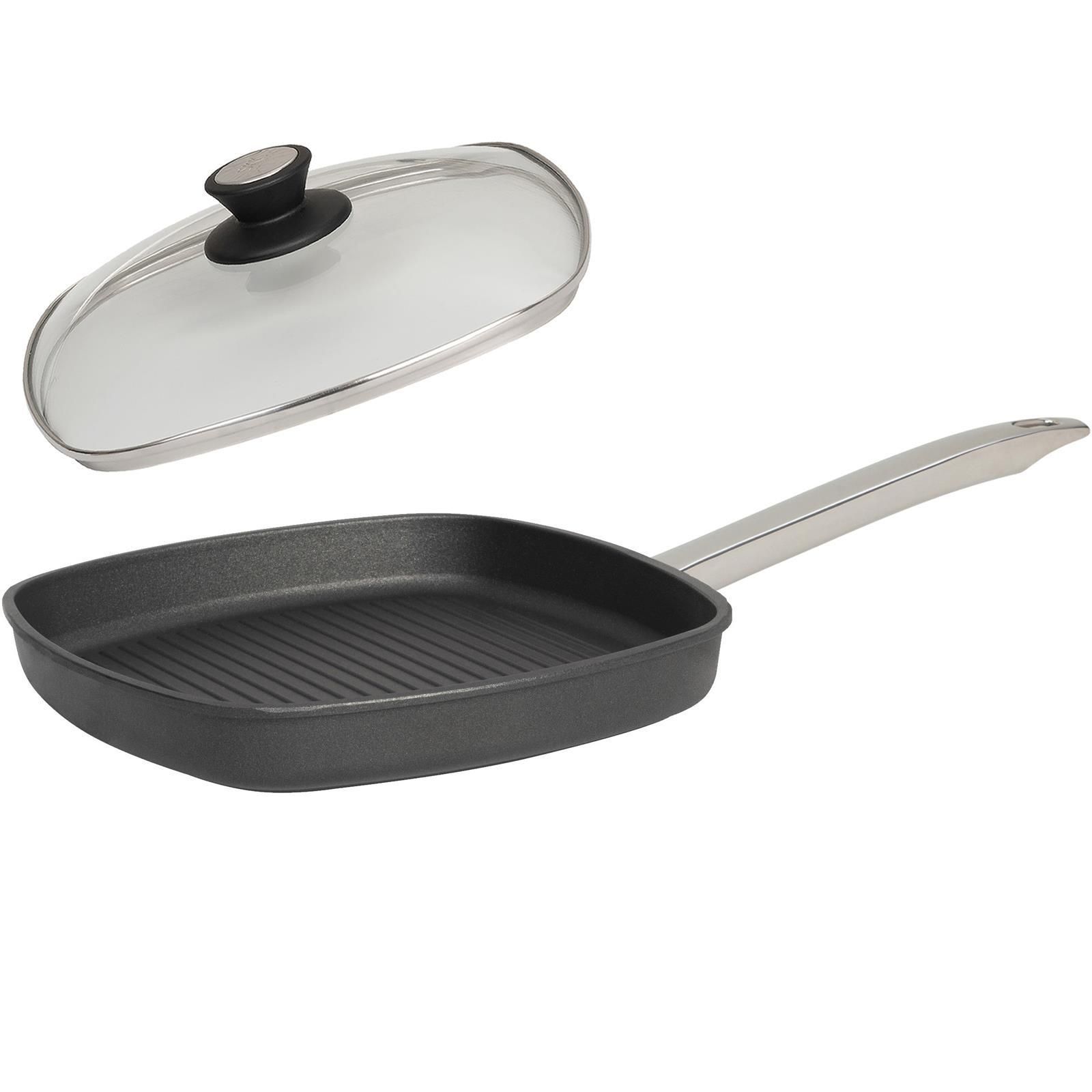 SKK eckige Grill-Pfanne 26x26 cm flach Guss beschichtet Edelstahl-Griff & Deckel