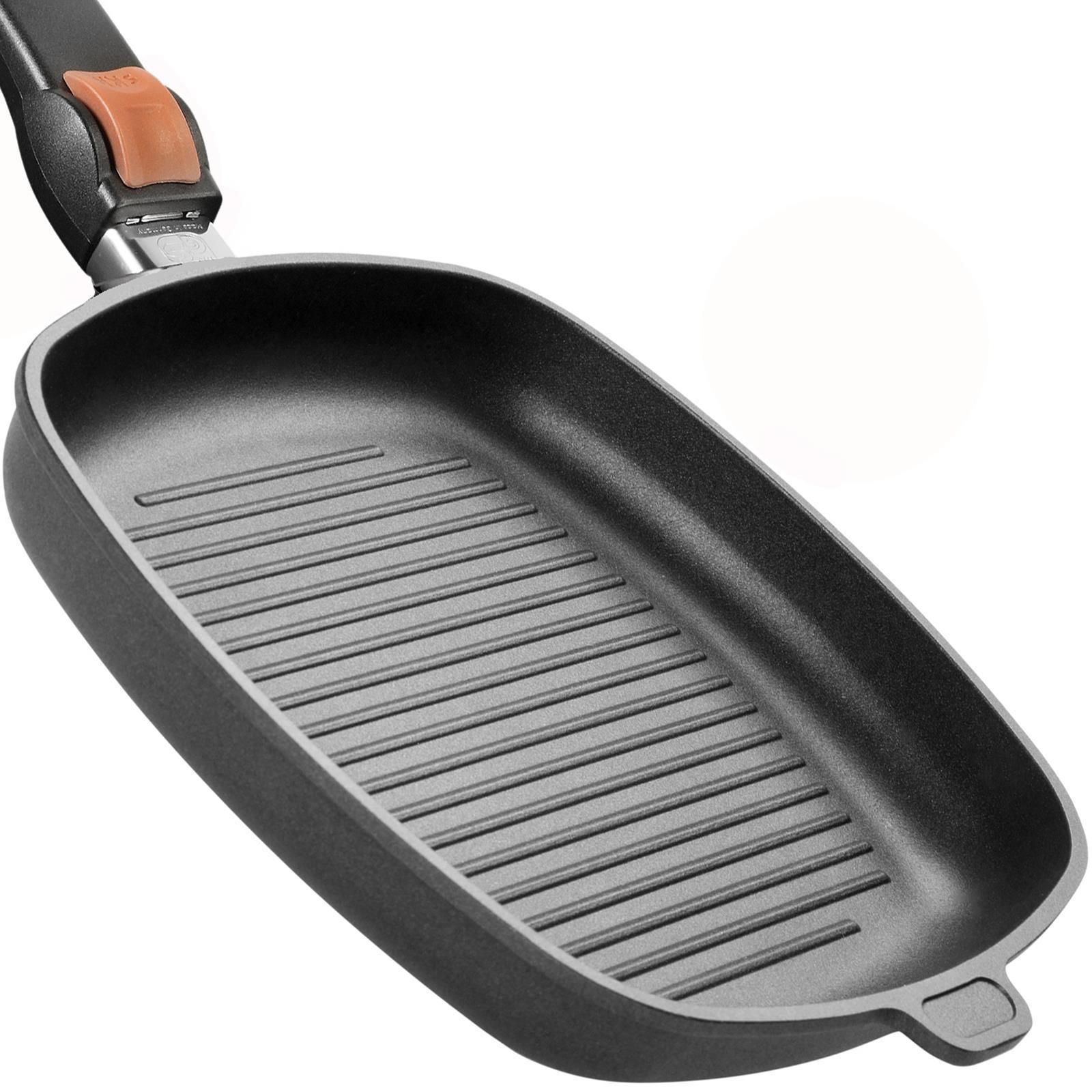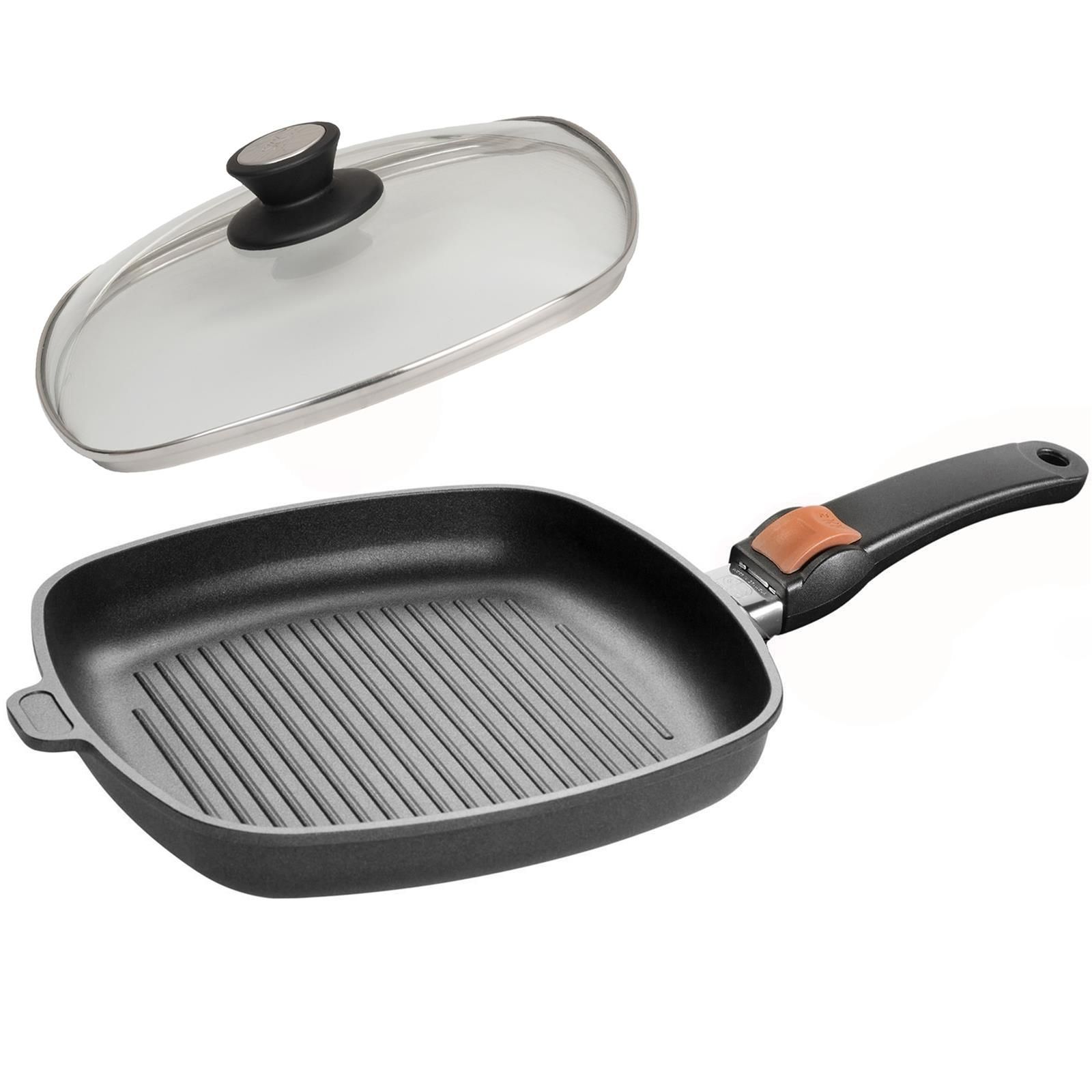 SKK Guss Eck-Grill-Pfanne 28x28 cm Induktion Antihaft Griff abnehmbar mit Deckel