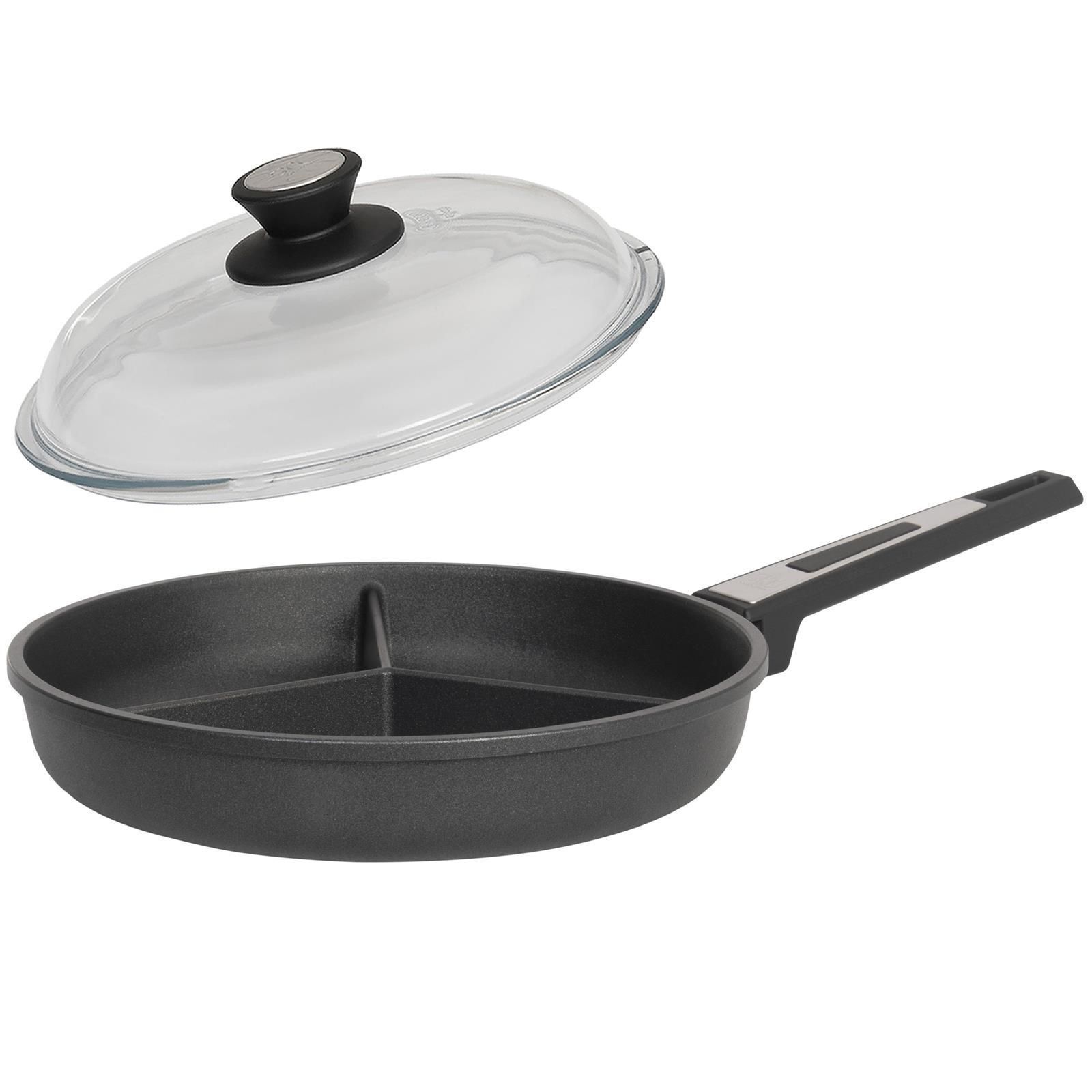 SKK Pfanne Ø 28 cm Guss 3-geteilter Steg Bratpfanne beschichtet mit Glasdeckel