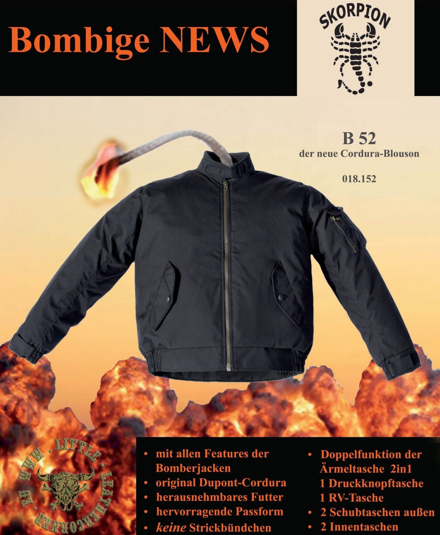 B52 Bomberjacke der Firma Skorpion Motorradmarkt GbR Textilblouson aus hochwertigen Cordura im Stil einer Bomber-Jacke mit Protektoren Diese Bomberjacke bietet mit der Reissa Klimamembrane einen perfekten Wetterschutz bei Regen, Schnee und Wind. Außerdem sorgt sie für eine gute Wasserdampf Durchläss