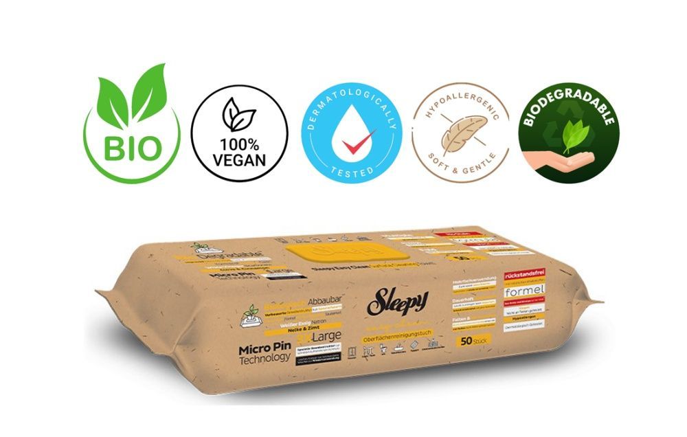 Verpackungseinheit: 1 Packung mit 50 Tücher Sleepy Easy Clean Bio Oberflächen und Boden Reinigungstücher 2 in 1 Gelb - 50 Tücher Sleepy Easy Clean Bio Reinigungstücher – die nachhaltige Lösung für eine mühelose, gründliche Reinigung. Diese einzigartigen Tücher kombinieren natürliche Inhaltsstoffe mit innovativer Technologie und bieten Ihnen eine umweltfreundliche Alternative zu herkömmlichen Reinigungsmitteln.