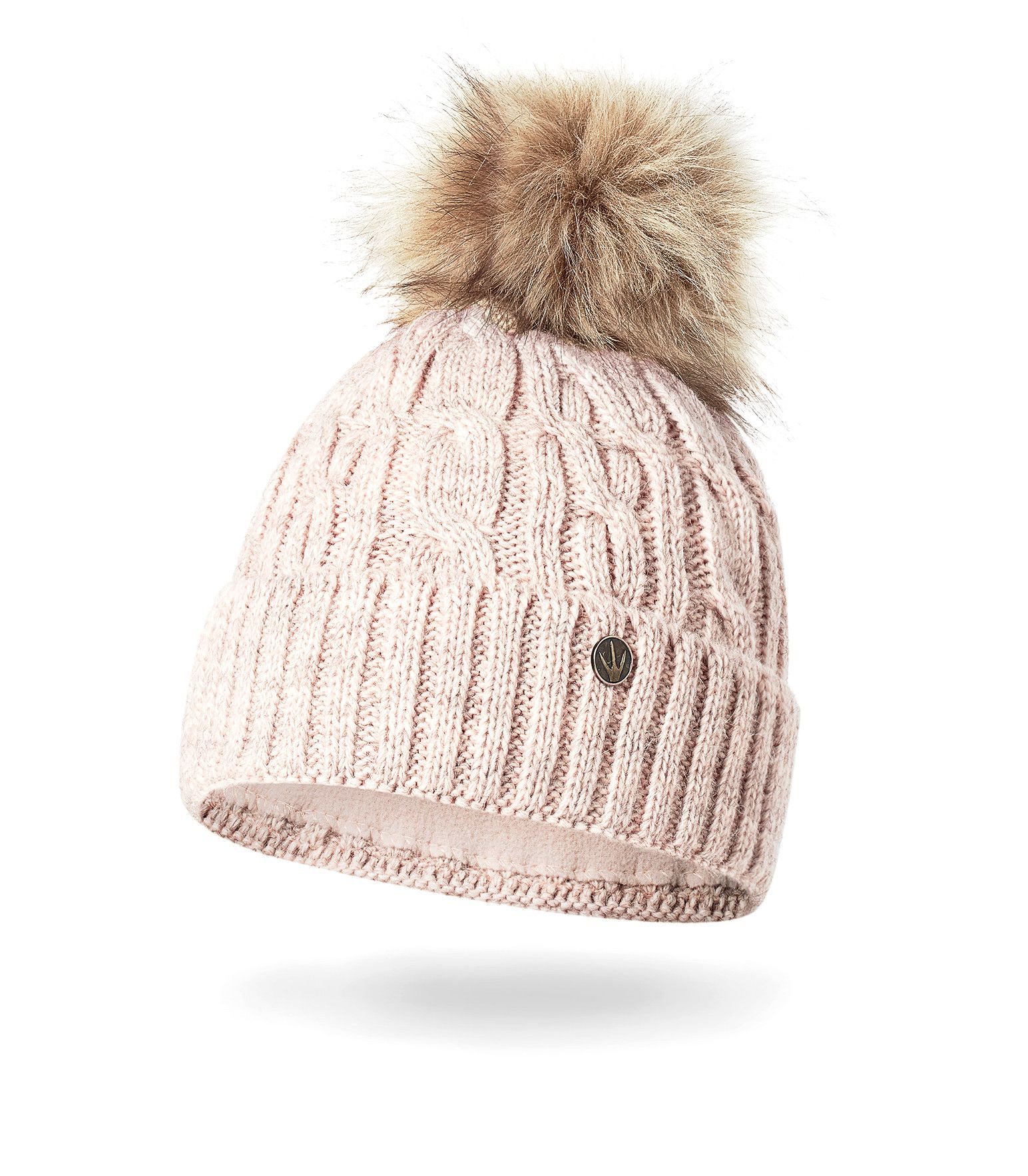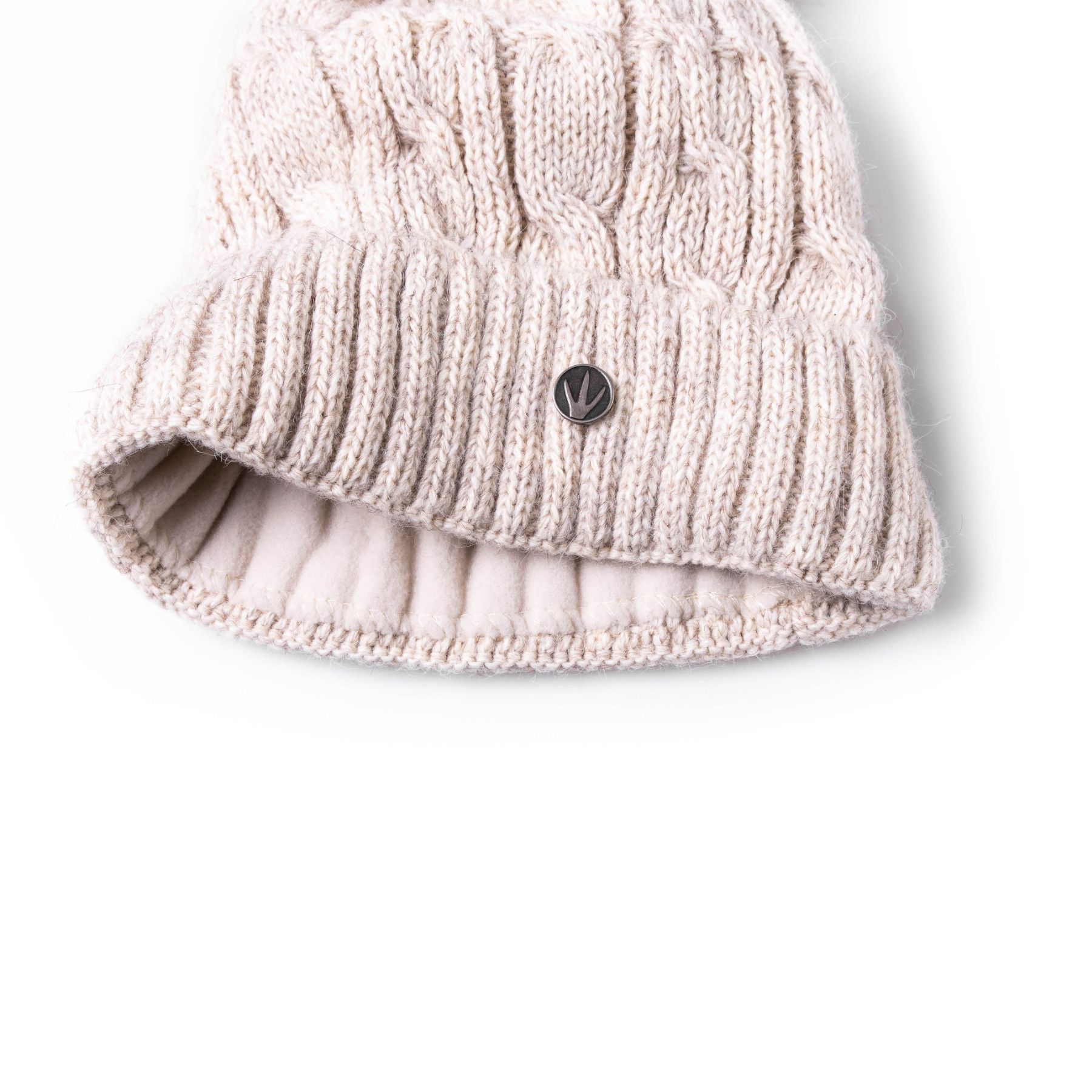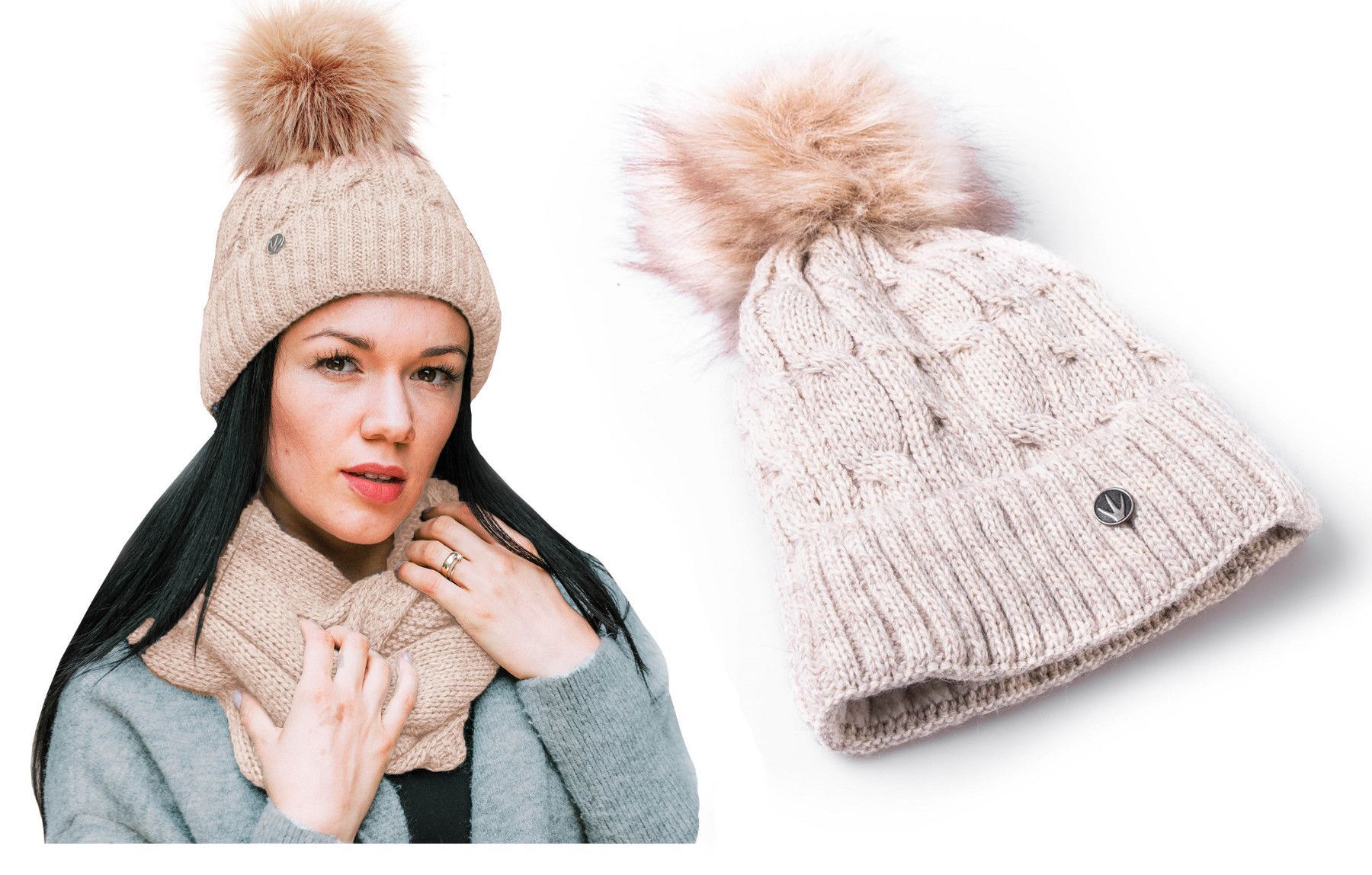 Slouch Beanie Damen Damenmütze warme Strickmütze Bommel Beige gefüttert