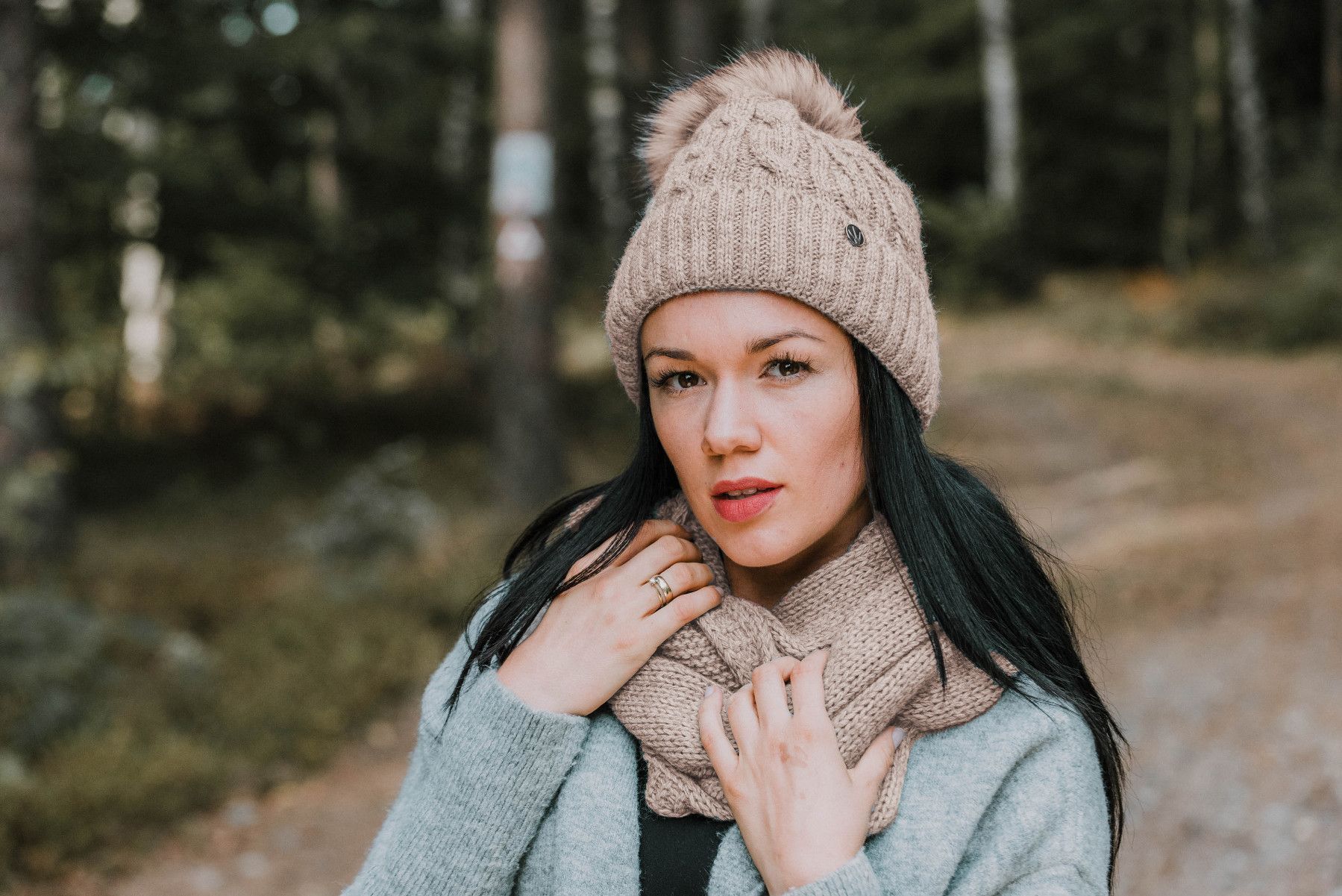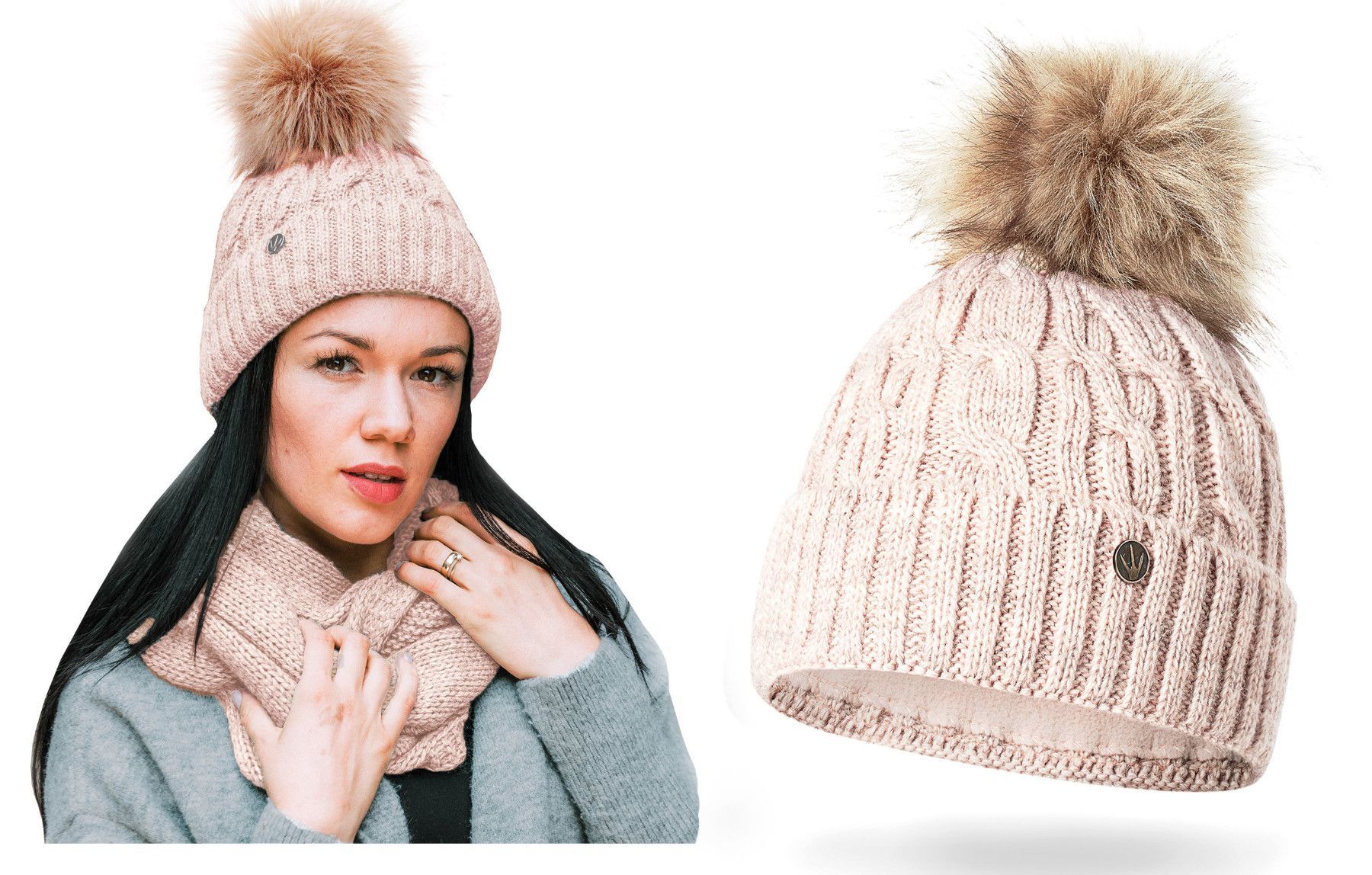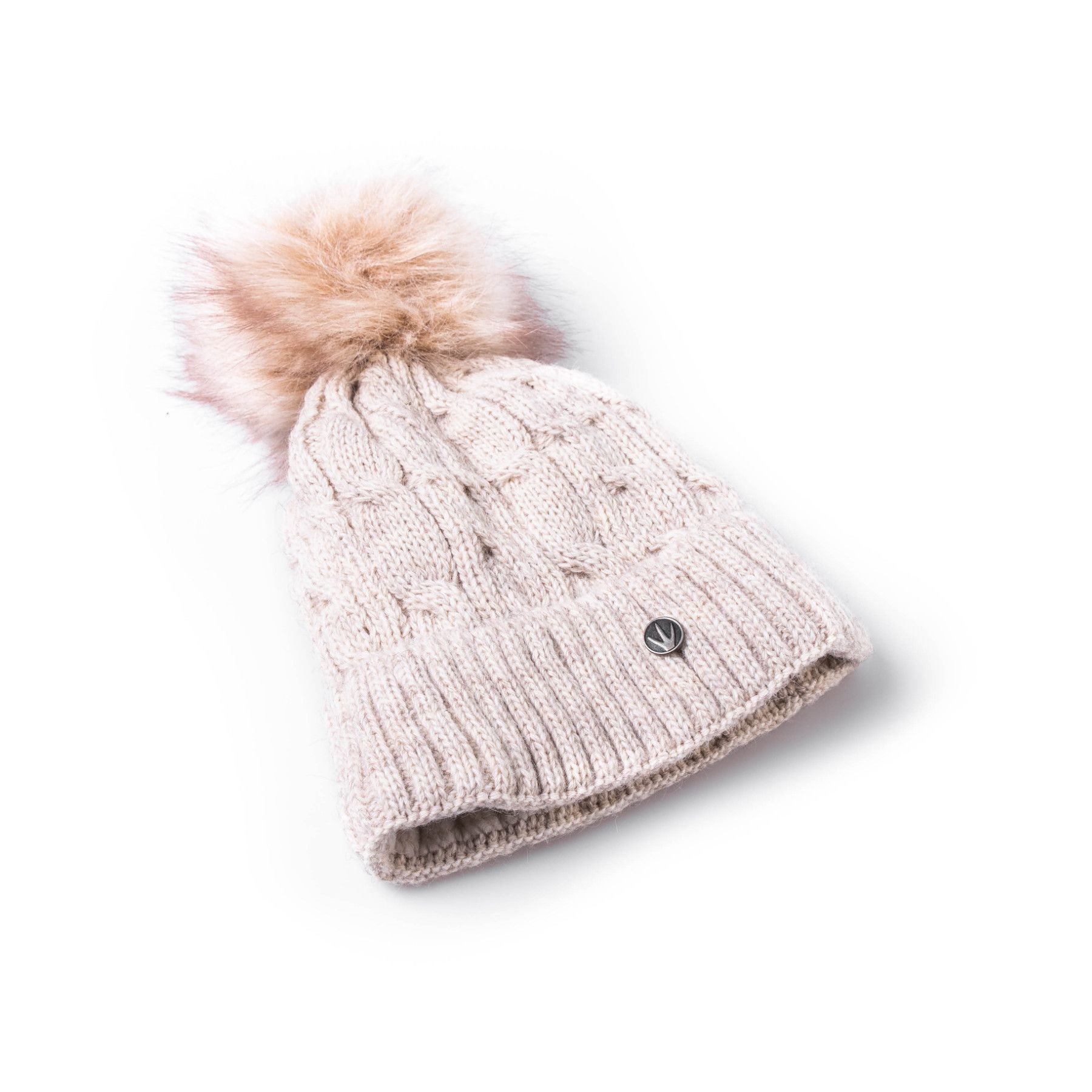 Slouch Beanie Damen Damenmütze warme Strickmütze Bommel Beige gefüttert