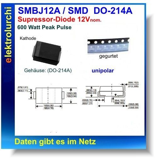 SMBJ12A, Supressordiode, 600Watt , 12Vol, SMD DO-214A, Zener Diode 5St