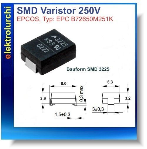 SMD 3225 Varistor, 250V/ ac, Epcos, Typ B72650M251K72, Überspannungsschutz,3St.