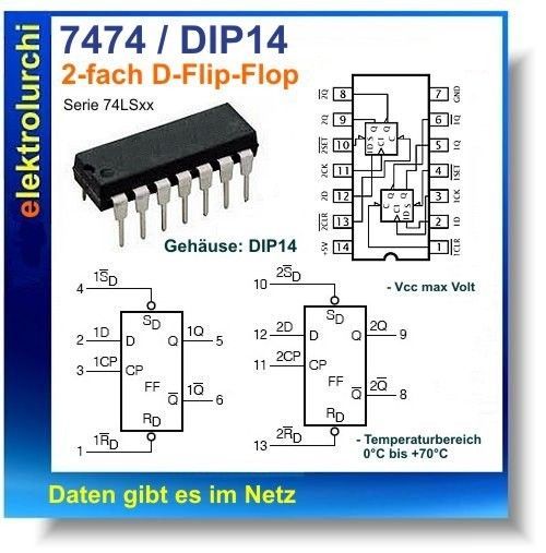 Sie bieten hier auf folgende Artikel NEU 5 Stück SN74LS74AN - 2-fach D-Flip-Flop DIP14, IC 7474, Texas Instruments Der Baustein zählt zu der TTL 74xx Serie Technische Daten Versorgungsspannung: 5VDC Betriebstemp.: 0EuroC to +70EuroC Gehäuse: DIP14 (Bild zeigt die Gehäuseform) Hersteller: Texas Instr