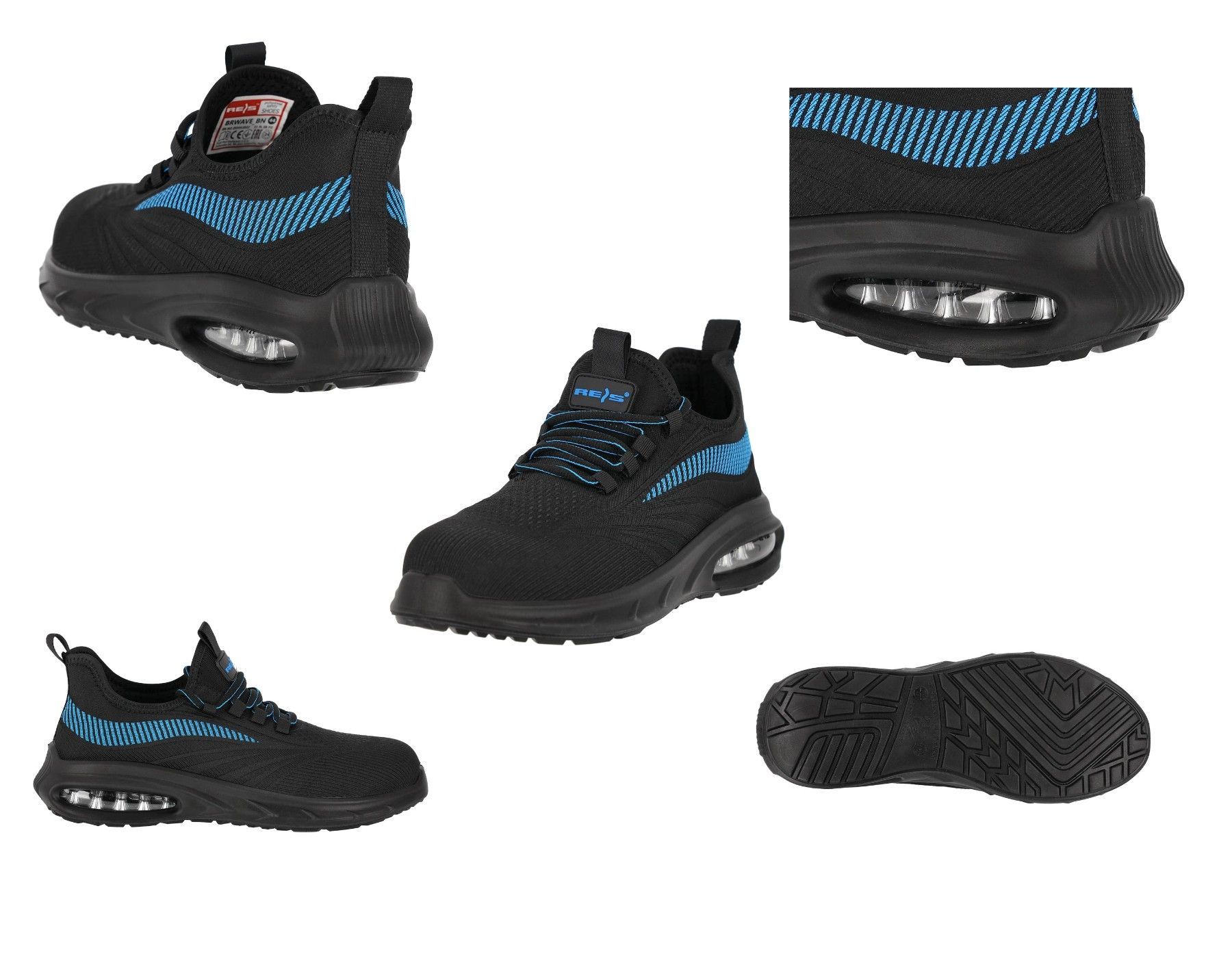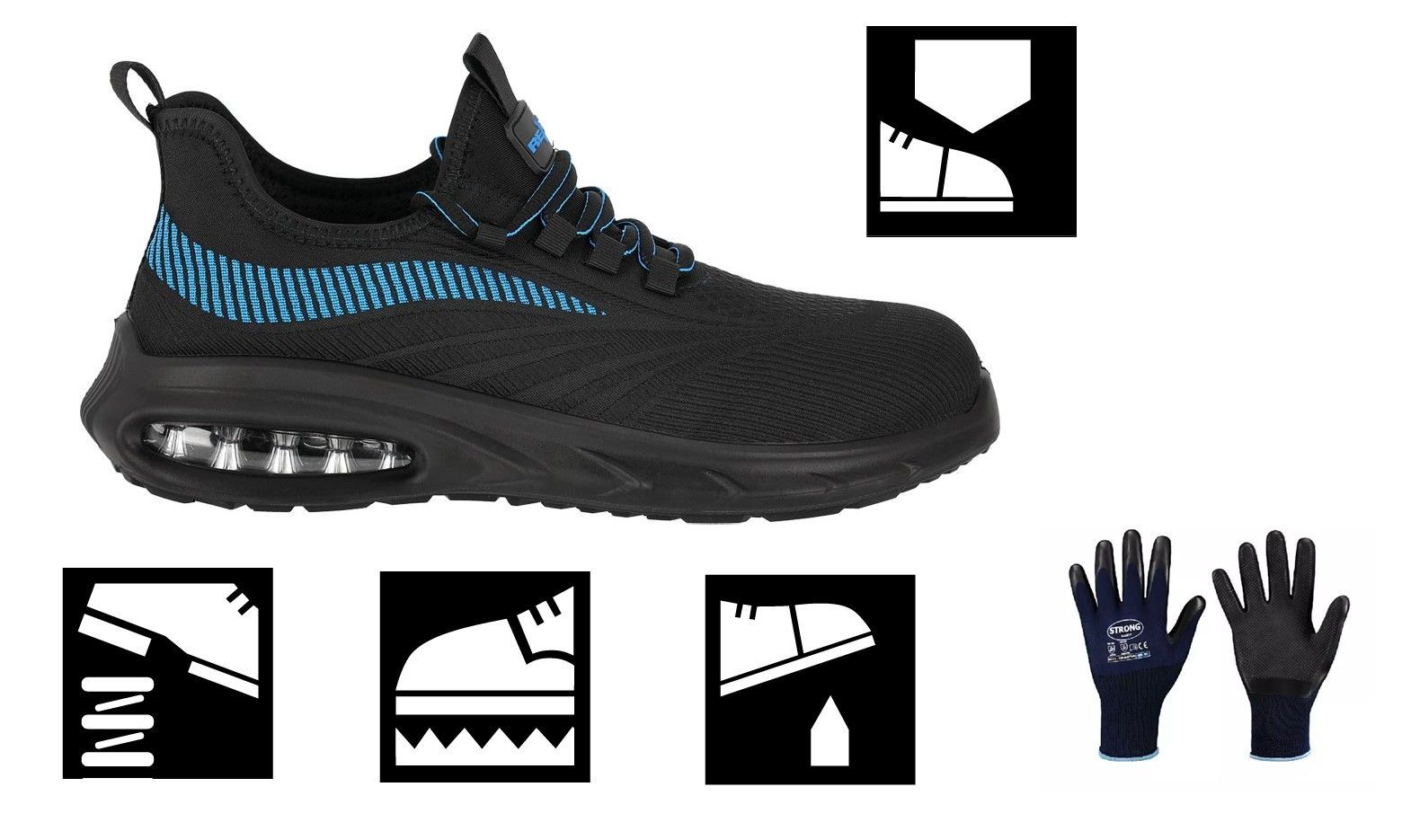 Sicherheitsschuhe Sneaker Arbeitsschuhe S1 PL schwarz-blau Größen 39 bis 47 PRODUKTBESCHREIBUNG Sommer Sicherheitsschuh S1 PL SR FO, sportlich, leicht & Sicher verfügbare Größen: 39-47 AUSSTATTUNG: WAVE sichere Schuhe. aus gestricktem Textilmaterial Niedrig geschnittene Schuhe, die über den Knöc