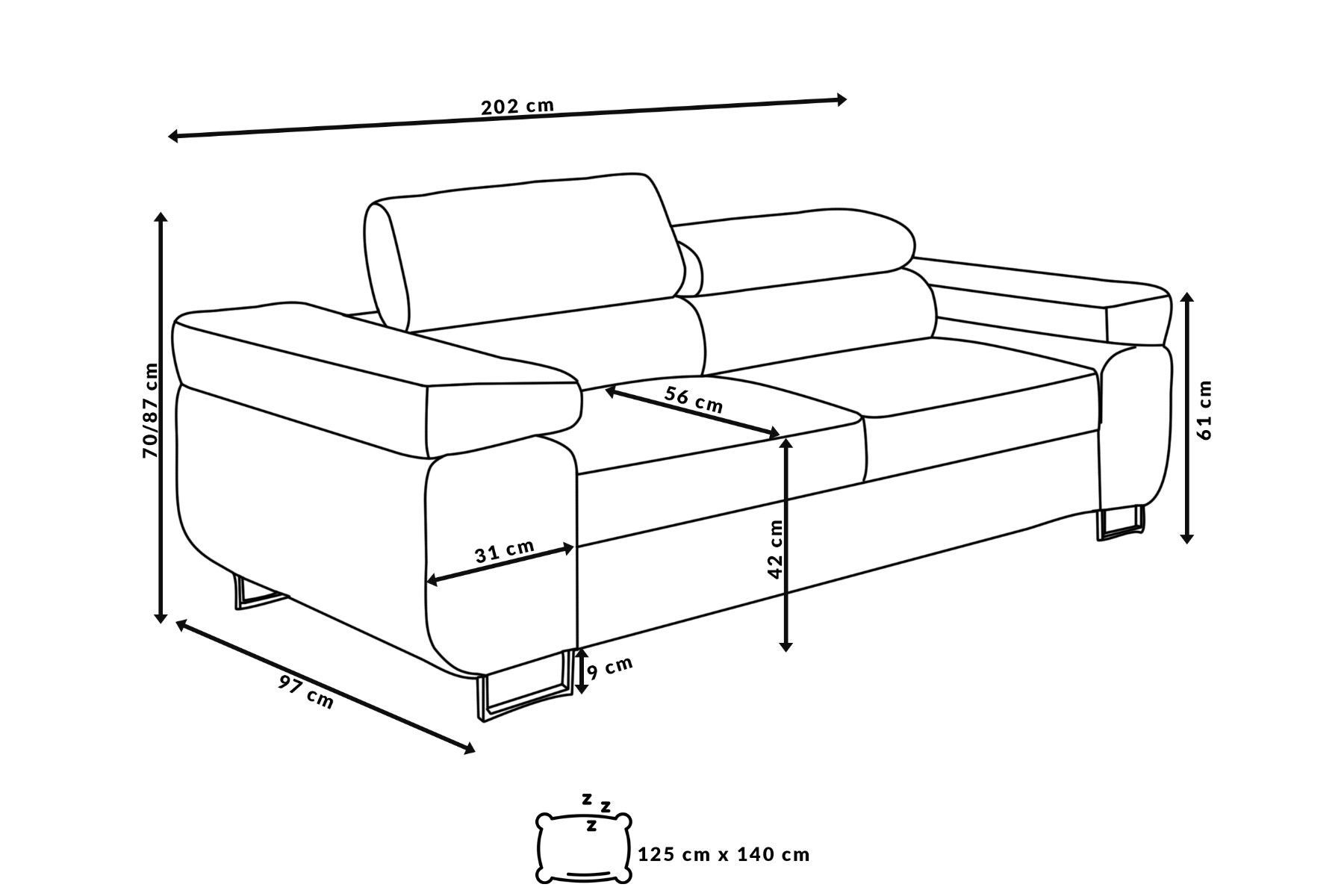 Sofa Marlene mit Schlaffunktion und mit verstellbaren Kopfstützen Bettkasten 202 cm