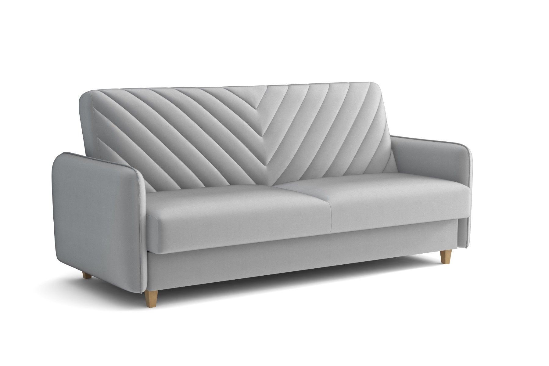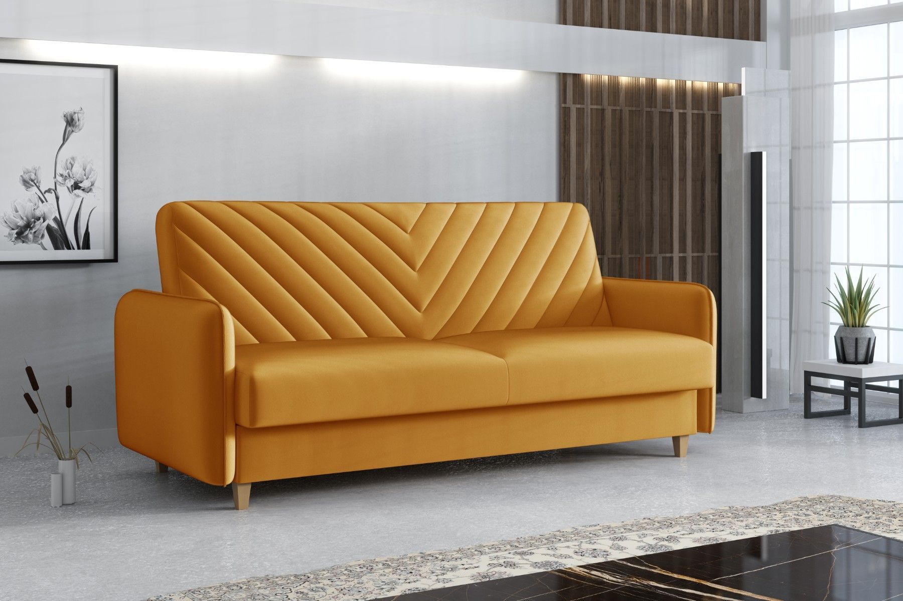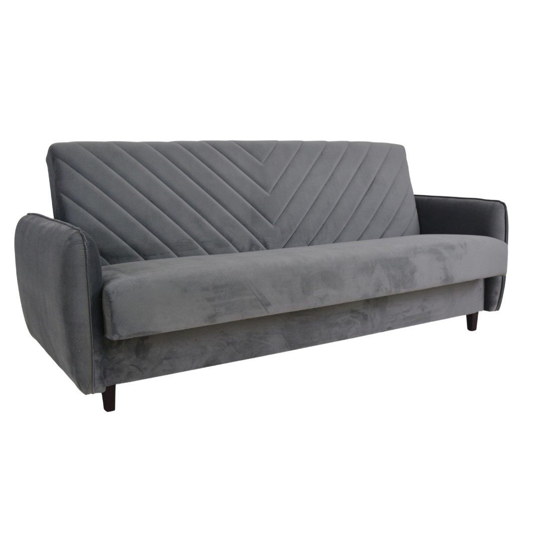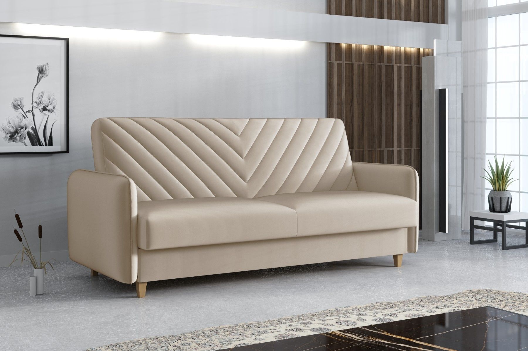 Schlafsofa Modeno 210x97x90 cm Dieses stilvolle Sofa bietet nicht nur ein ansprechendes Design, sondern auch hohen Komfort. Die vertikal gesteppten Polster sorgen für eine moderne Ästhetik, während die gepolsterten Armlehnen zusätzliche Gemütlichkeit bieten. Ideal für jeden Wohnraum, lässt sich das
