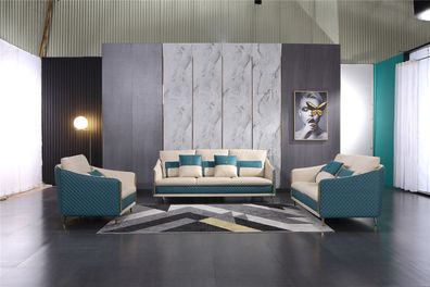 Sofagarnitur Polster Set 3-Sitze Sessel Blau Grau Ledersofas Polster