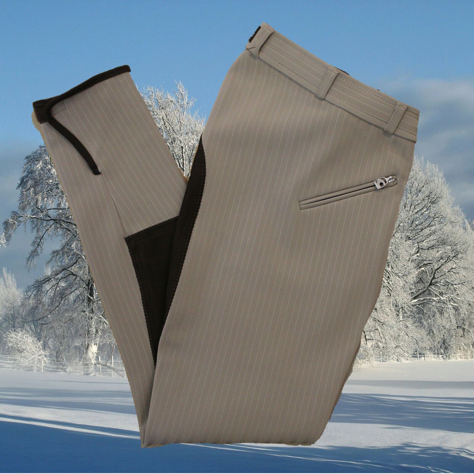 Reithose Champion - in oak-kaffee Streifen · Winter Softshellreithose · Schlanke Form · Vollbesatz aus Cavasoft · Ohne Seitennaht · Eine Reißverschlusstasche vorne · Bund mit Gürtelschlaufen · Beinabschluss mit Klett · Schmutz- und Feuchtigkeit