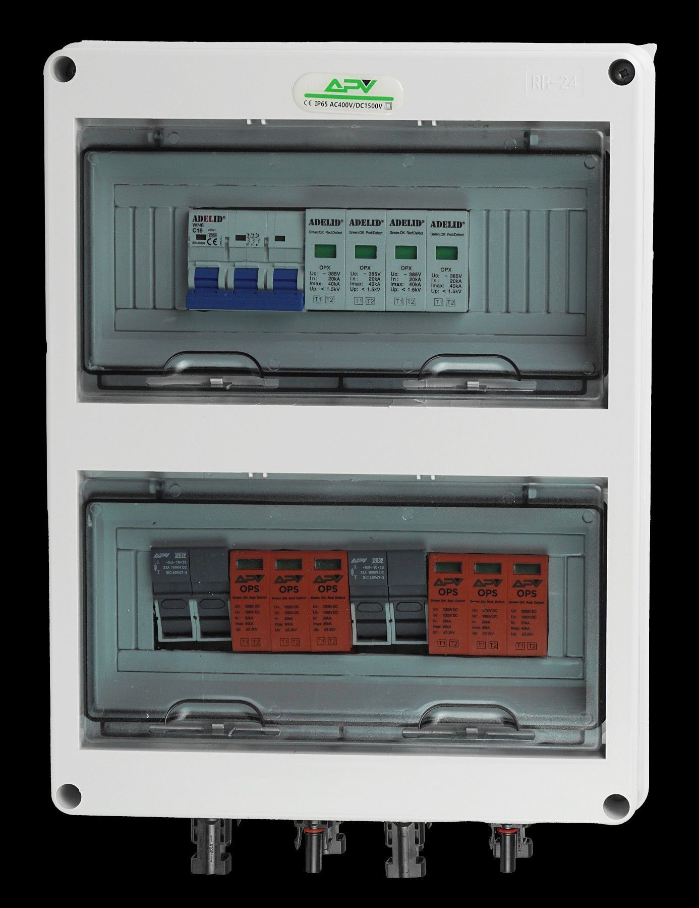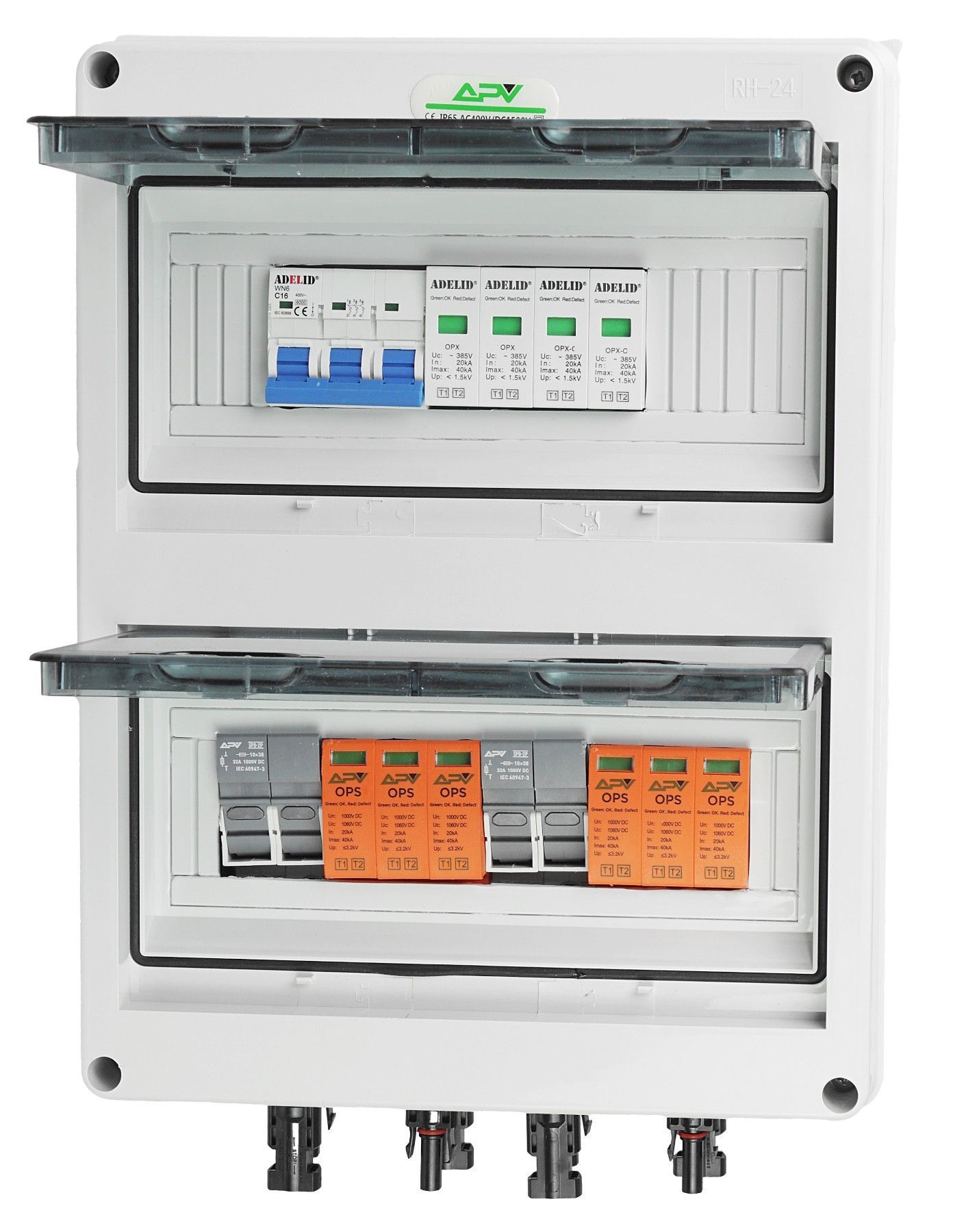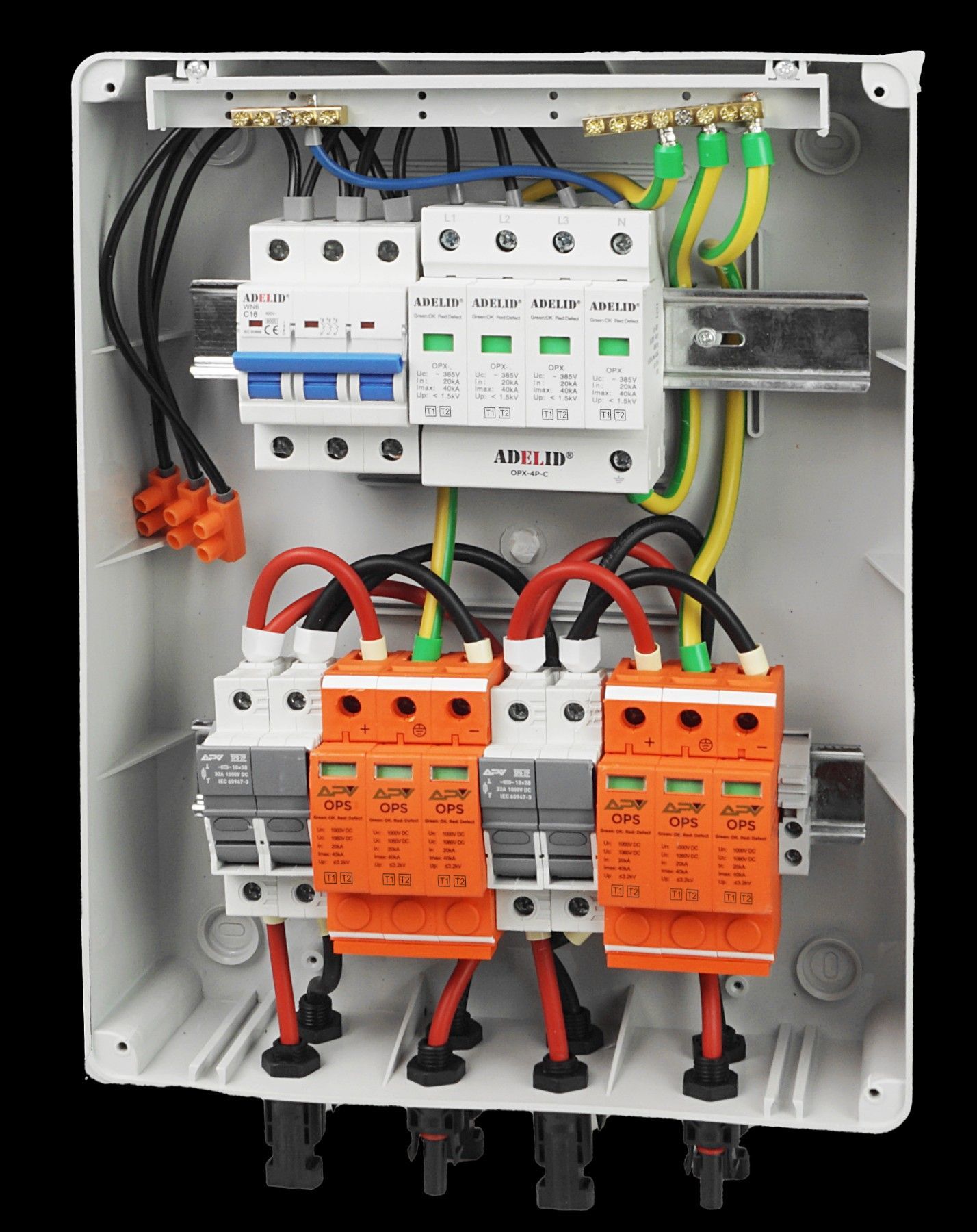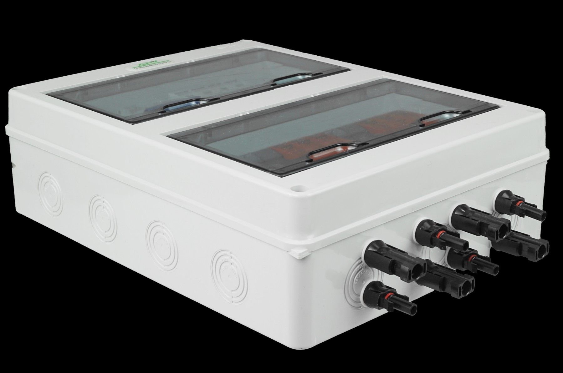 Hochwertige Solar Anschlusskasten 2-Strings 24-Module Schutz von PV-Anlagen vor Überlastungen und Auswirkungen von Kurzschlüssen in DC- oder AC DC- Photovoltaikanlagen. Fertig verkablet, steckerfertig. Das Produkt ist normgerecht mit 6,0 mm2 Solarkabel verkabelt. Varistoreinsatz kann ohne Abklemmen