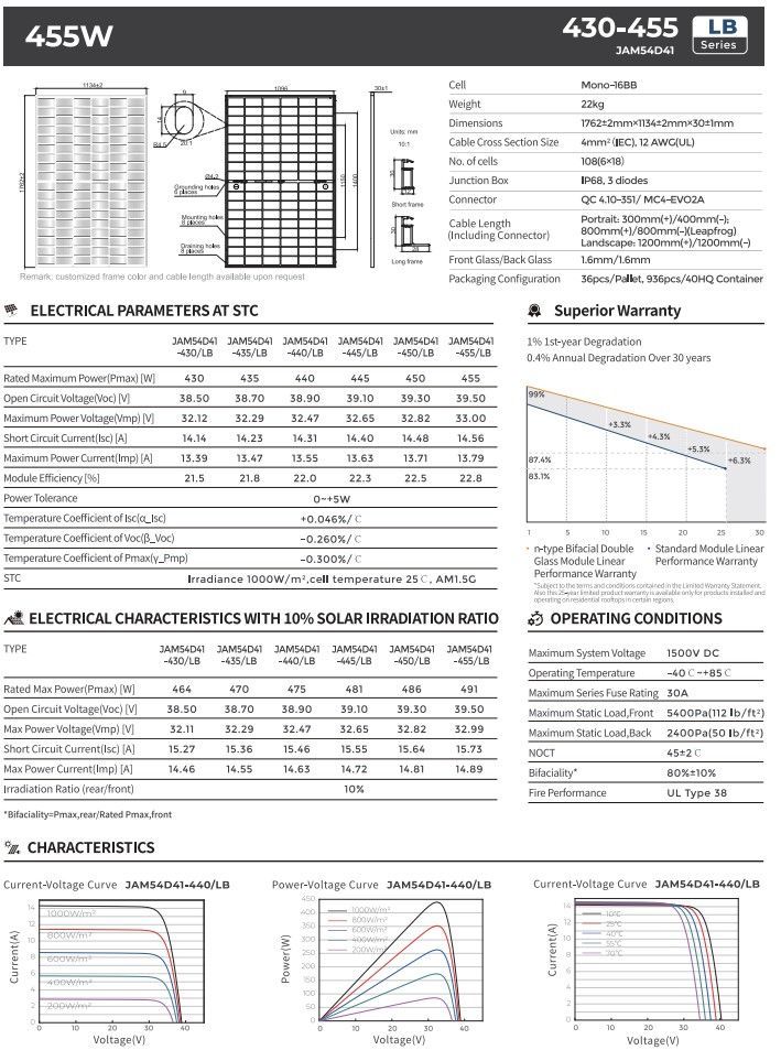 Solarmodul JA Solar 450W Bifazial, Glas-Glas JAM54D41 Solarpanel PV 0% MwSt