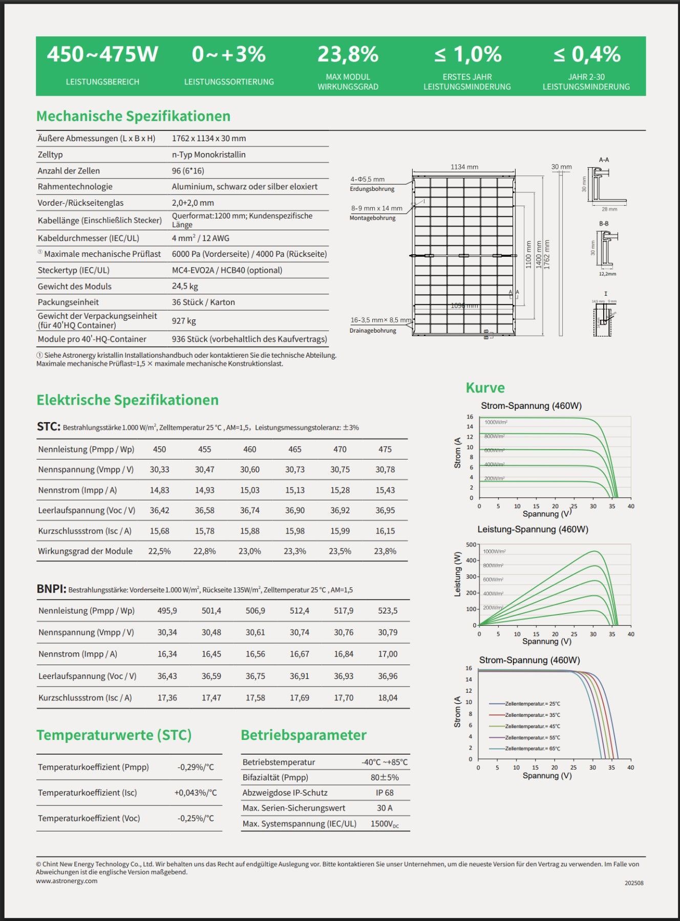 BITTE GEBEN SIE EINE GÜLTIGE RUFNUMMER FÜR DIE SPEDITION AN !!! Technische Daten entnehmen Sie bitte den Bildern !!! AstronergySolarmodul 460Wp BF, bifazial 48 Zel CHSM48RN(DG)BF460 Astro N7s Modul DG = Glas Glas 2+2mm BF = Black Frame bifazial sehr gutes Schwachlichtverhalten 460 Wp 48 Zellen schwa