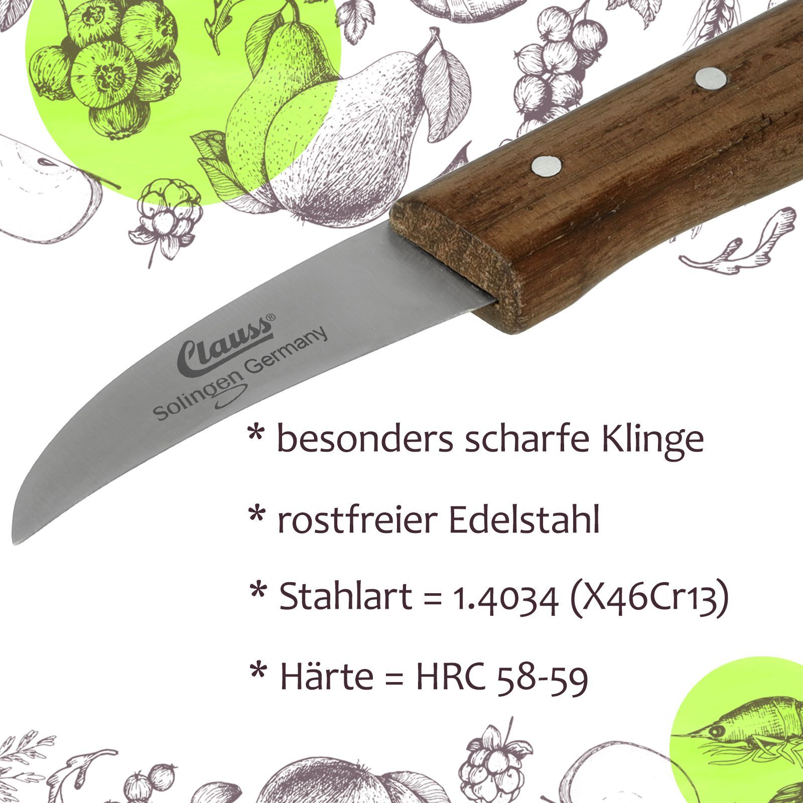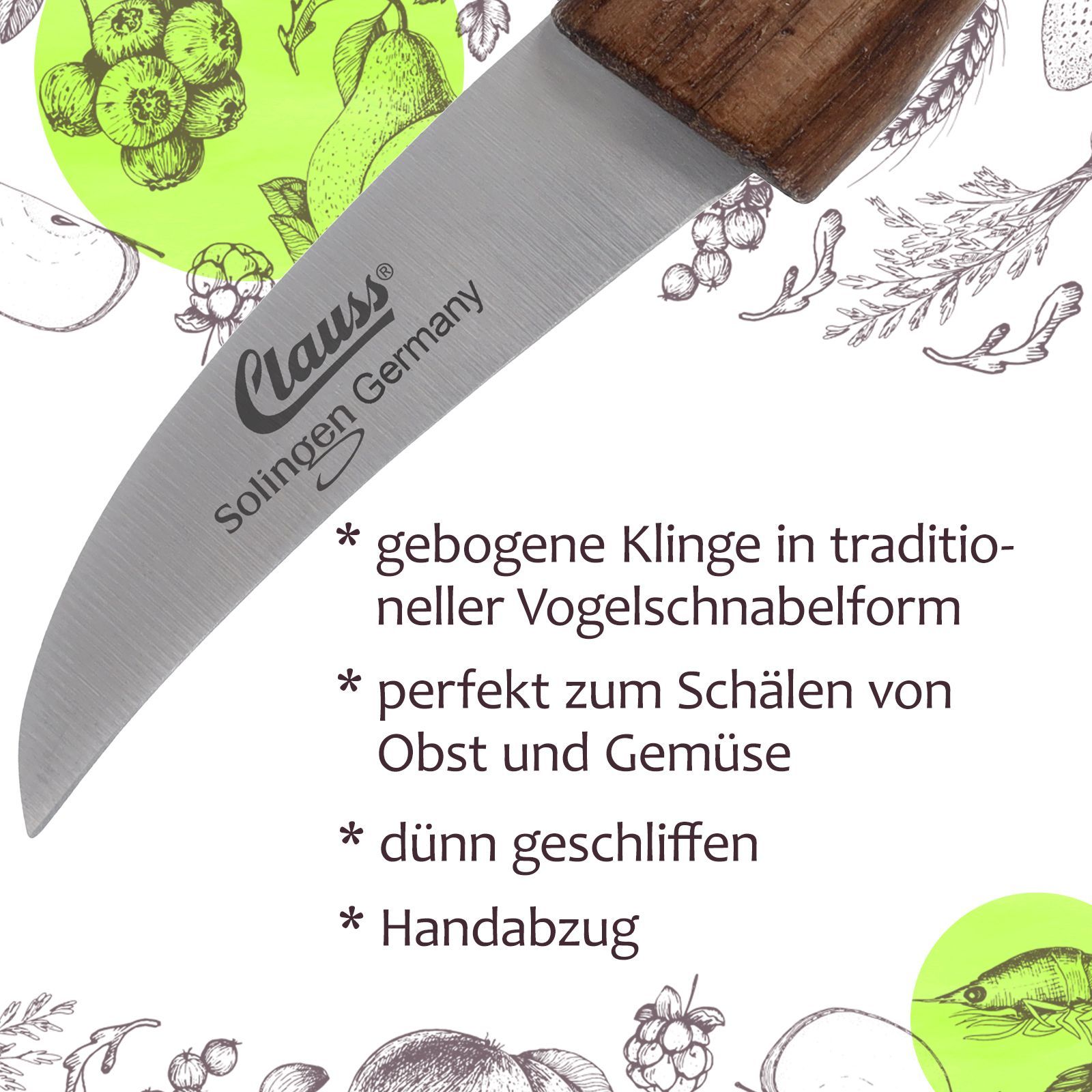 Das original CLAUSS Schälmesser Made in Solingen ist besonders scharf - traditionell sehr dünn geschliffen und fachgerecht von Hand geschärft (Handabzug). Das hochwertige Küchenmesser überzeugt durch seine Qualität, ist schnitthaltig und langlebig. Die Edelstahlklinge aus Spezialstahl ist rostfrei und robust. Jeder der ergonomischen Griffe aus Echtholz ist handverlesen und als Naturprodukt mit einzigartiger Maserung, Farbe und Wuchsrichtung ein Unikat. Der Griff überzeugt als Handsc...