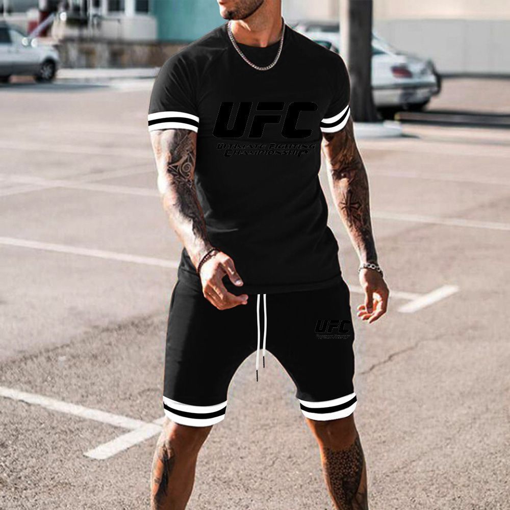 Sommer Herren Sportanzug UFC Freizeit Druck T-shirt Hose 2er Set Schwarz02