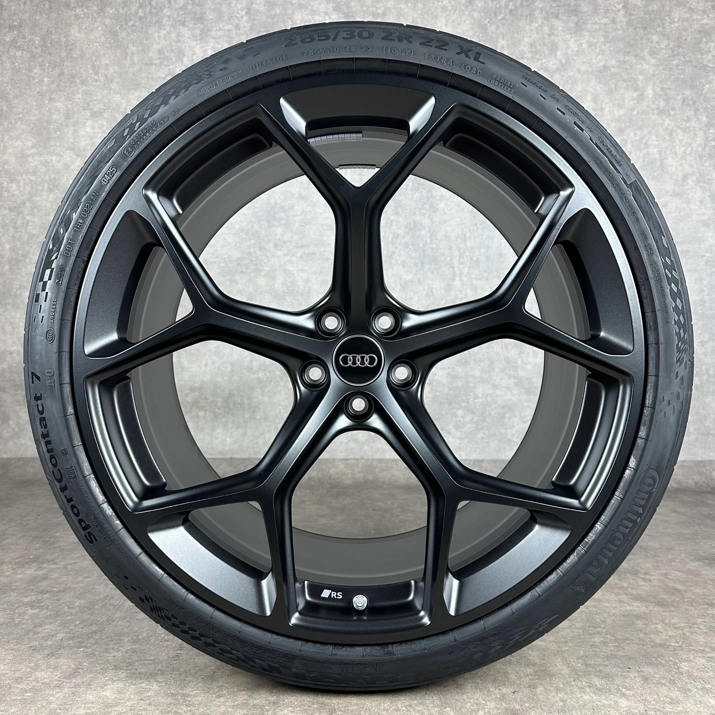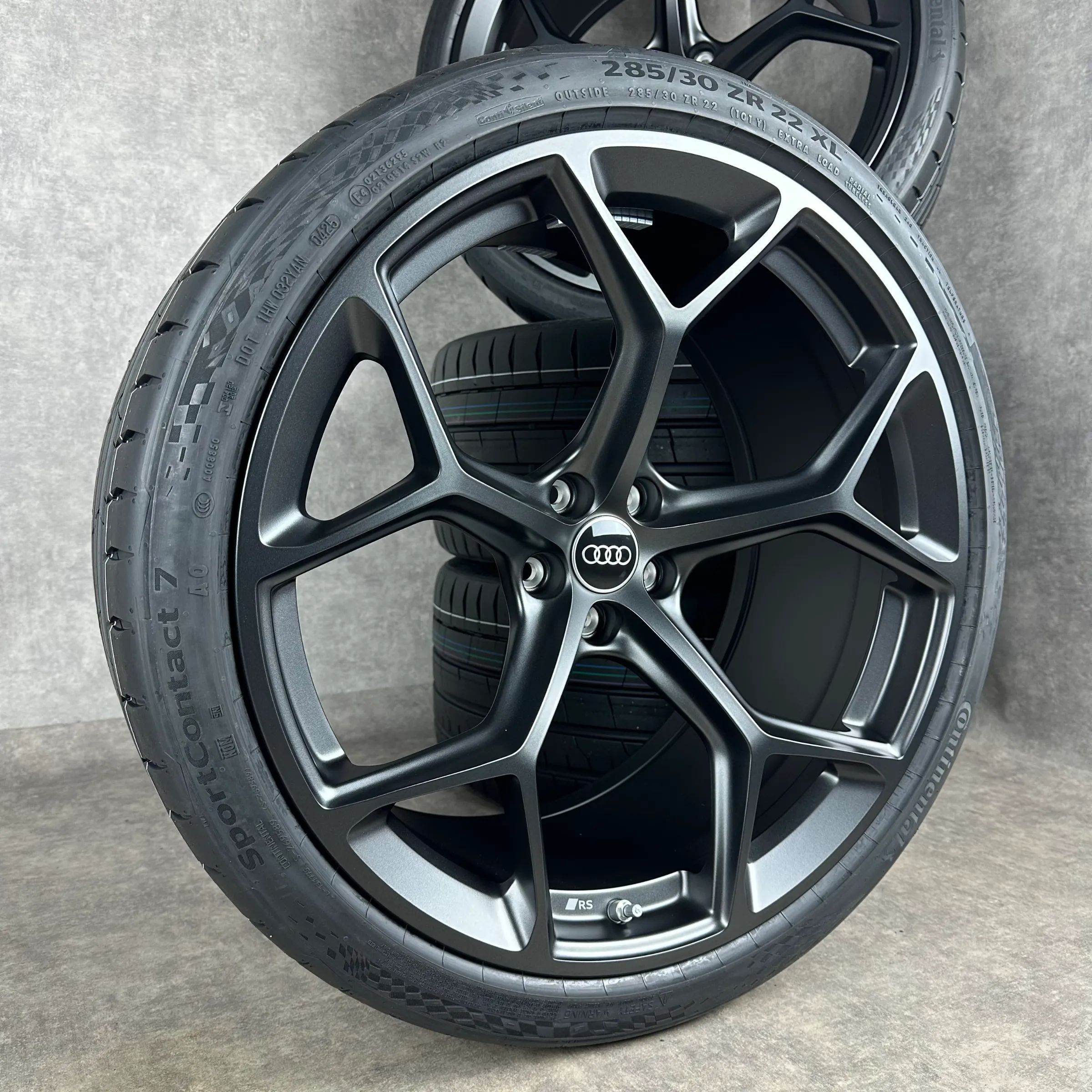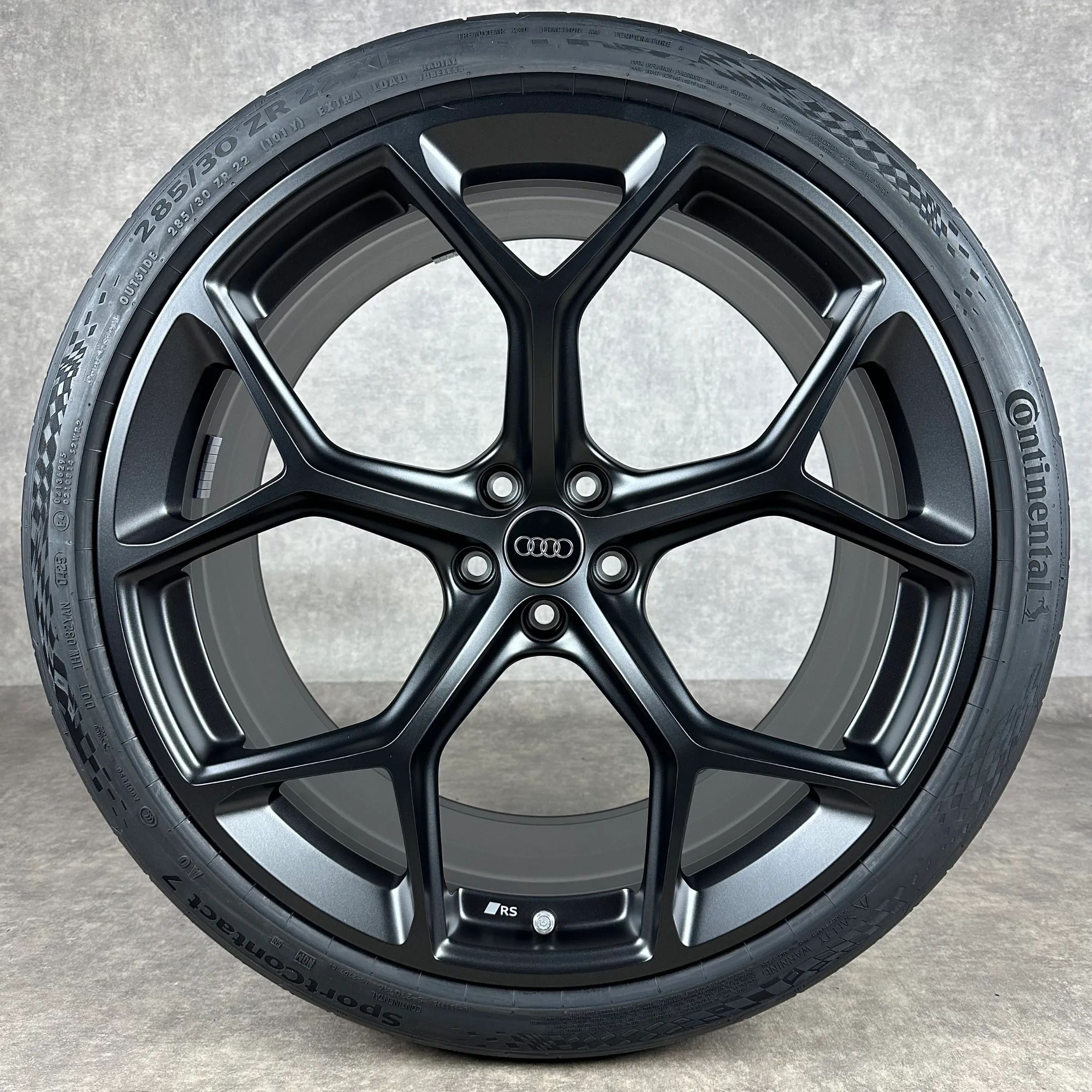 4x Original AUDI 22 5-V-Speichen Felgen Sommerkompletträder schwarz matt Original Lack Dimension: 10,5Jx22 ET19 Teilenummer: 4K0601025BM 285 30 R22 101Y Continental SportContact 7 AO, neu Angeboten werden 4x Original AUDI 5-V-Speichen Sommer-Kompletträder in schwarz matt. Die Felgen sind neu. Die Re
