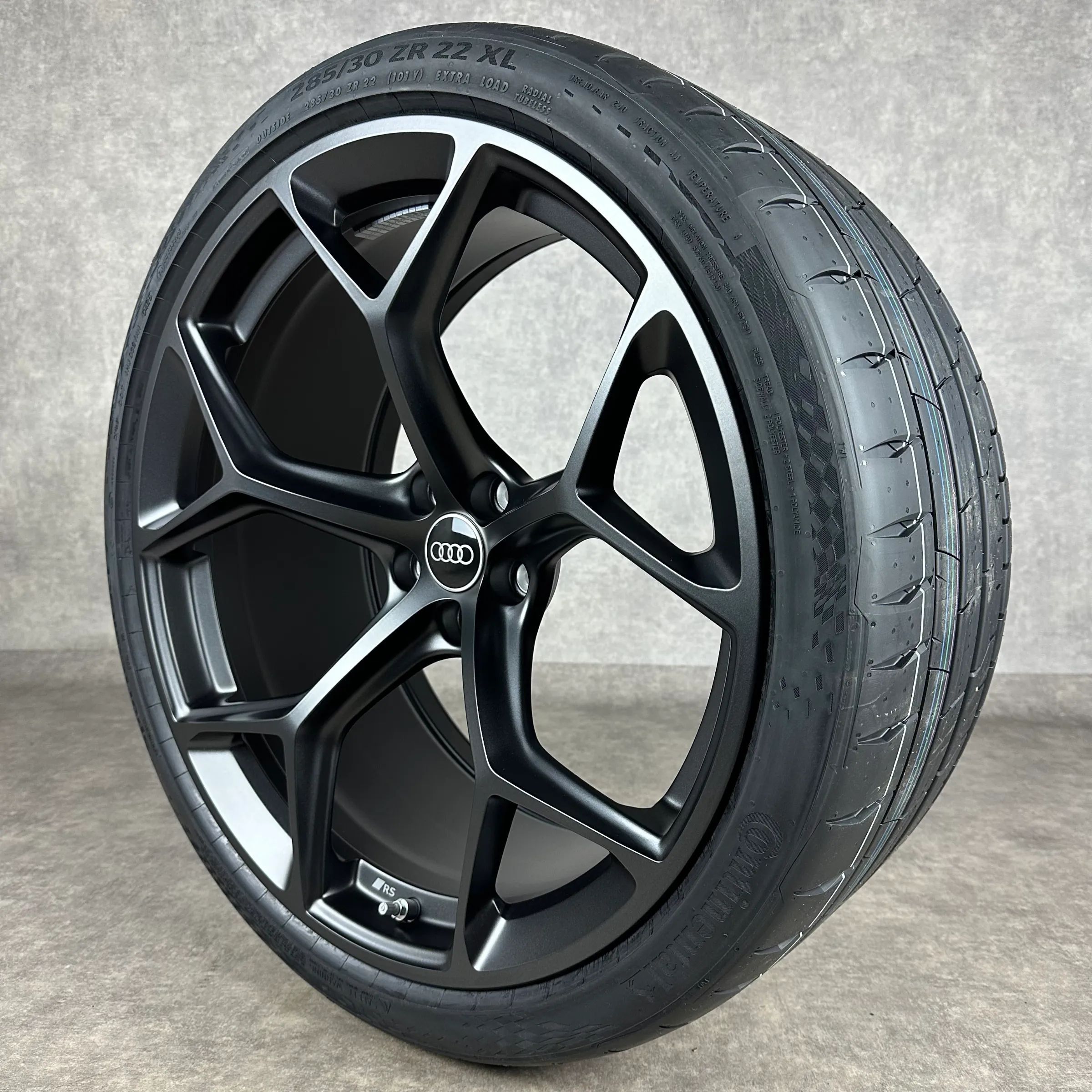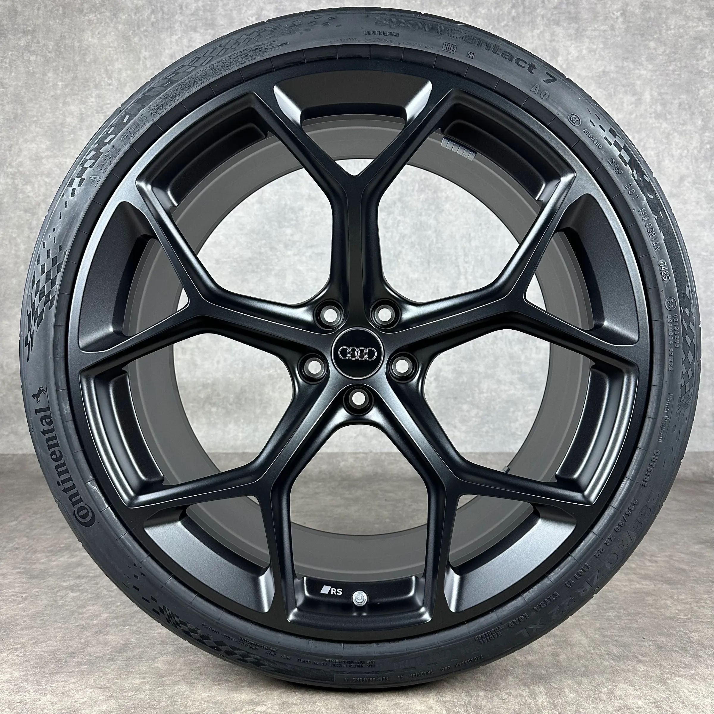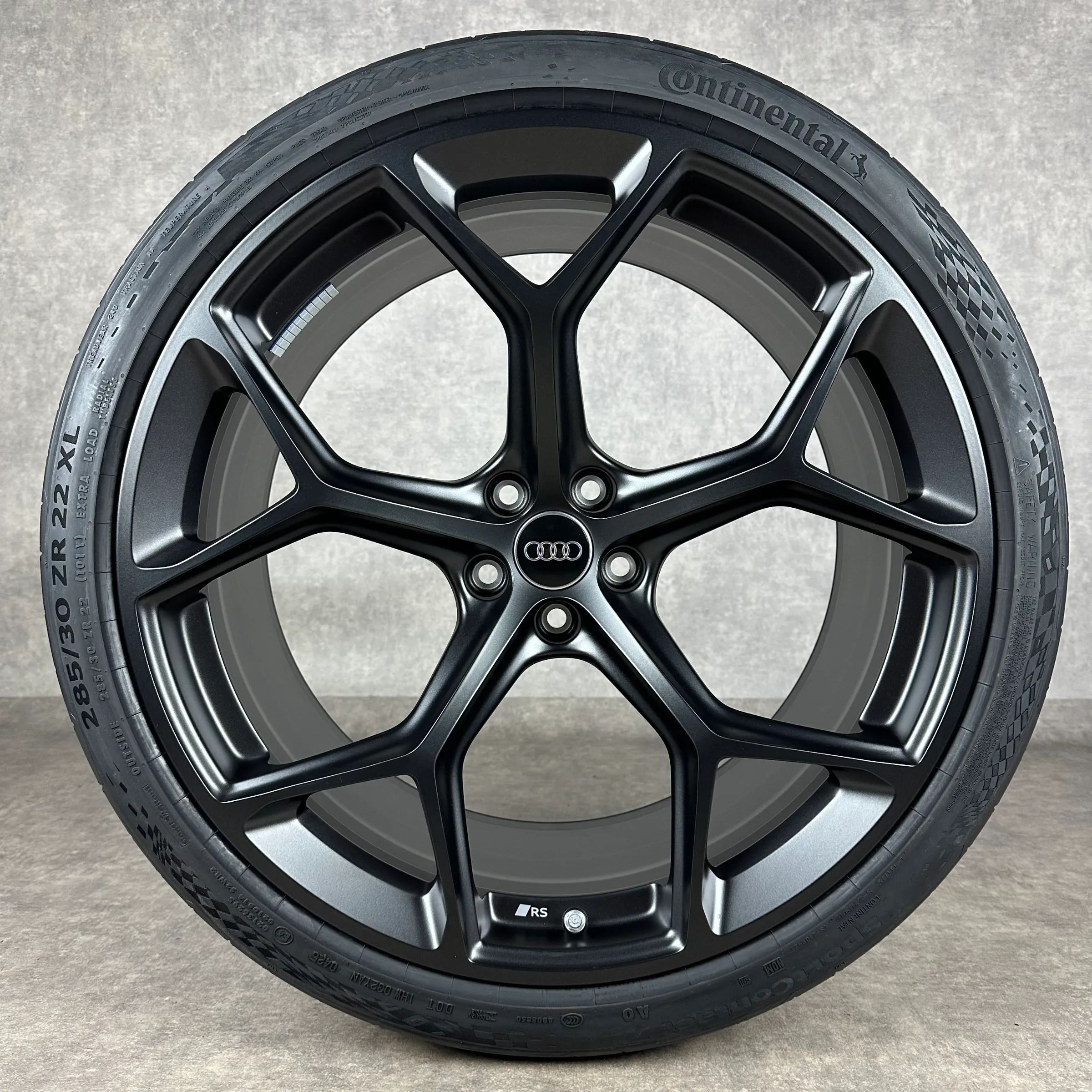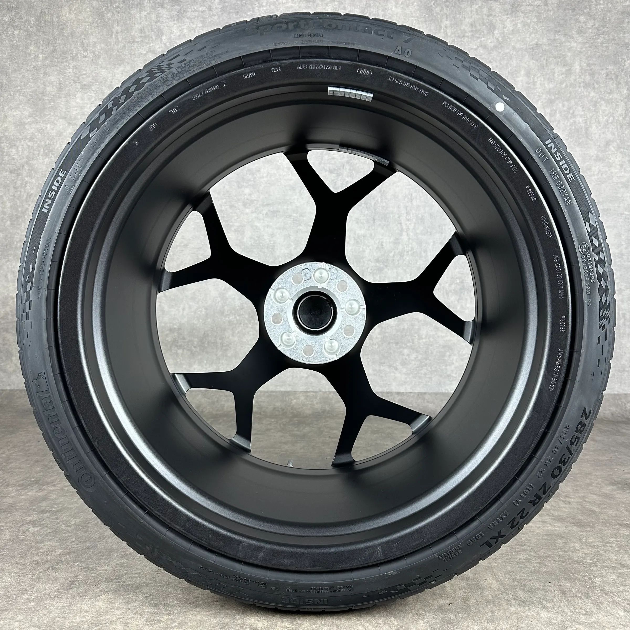 4x Original AUDI 22 5-V-Speichen Felgen Sommerkompletträder schwarz matt Original Lack Dimension: 10,5Jx22 ET19 Teilenummer: 4K0601025BM 285 30 R22 101Y Continental SportContact 7 AO, neu Angeboten werden 4x Original AUDI 5-V-Speichen Sommer-Kompletträder in schwarz matt. Die Felgen sind neu. Die Re