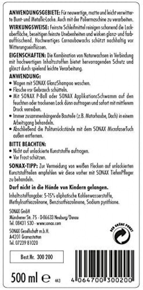 SONAX 0300200 AutoPolitur Bunt Metallic Lacke Auto KFZ Wachs Politur 500 ml