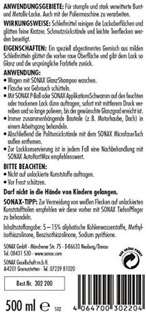 SONAX 03022000 LackReiniger Bunt Metallic Lacke Auto KFZ Politur 500 ml