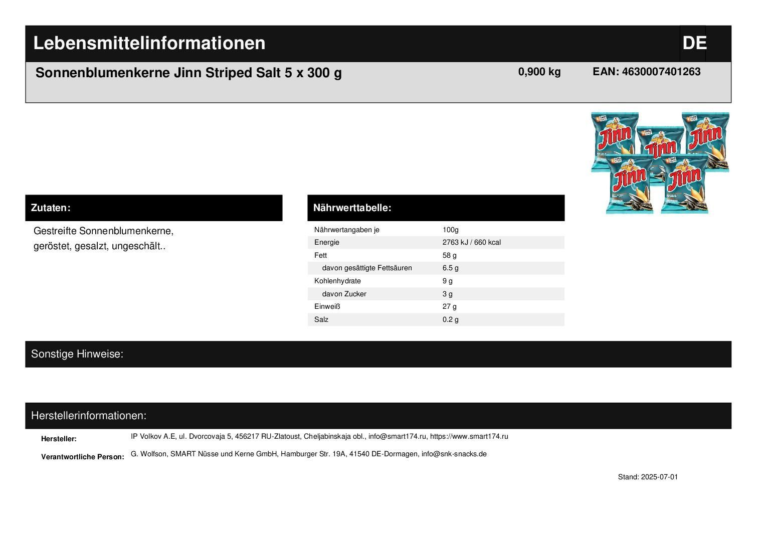 Sonnenblumenkerne Jinn 5 x 300 g Striped Salt geröstet und gesalzt ungeschält