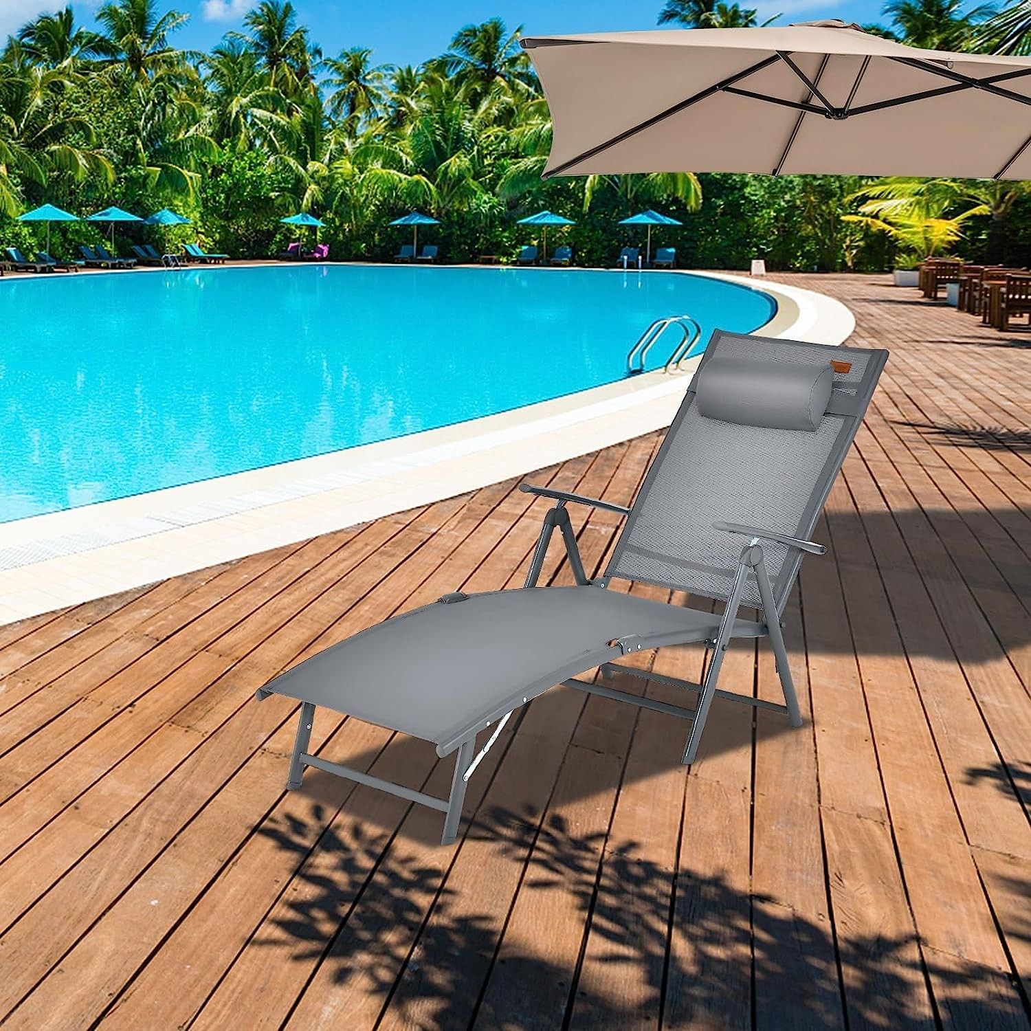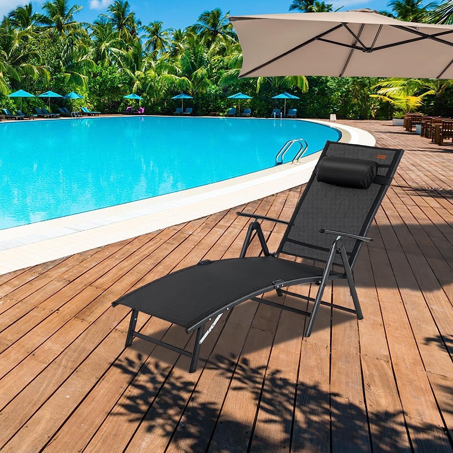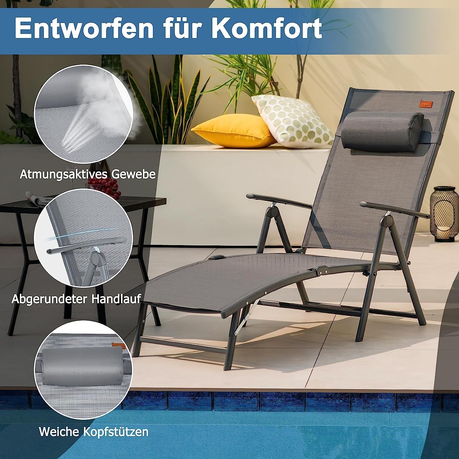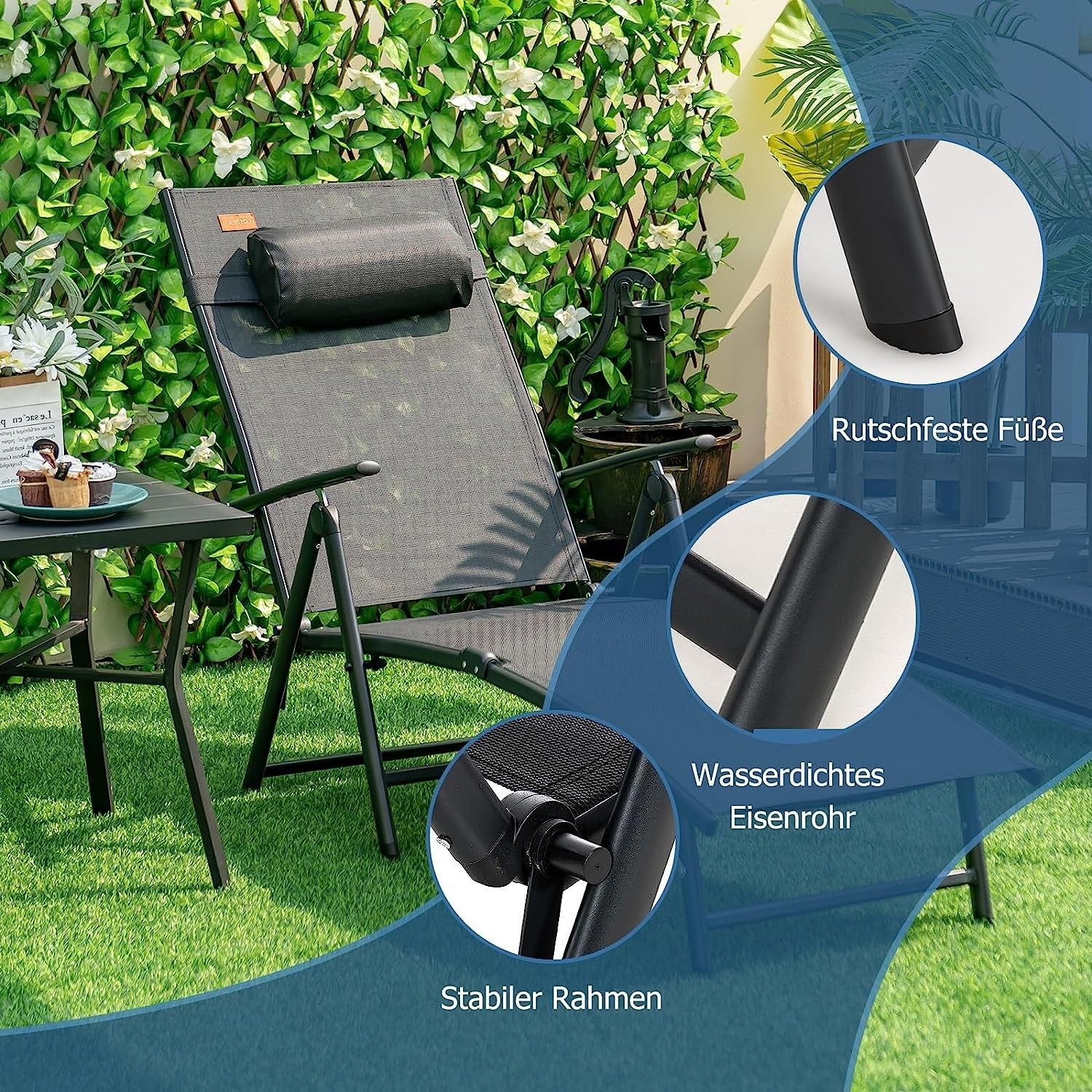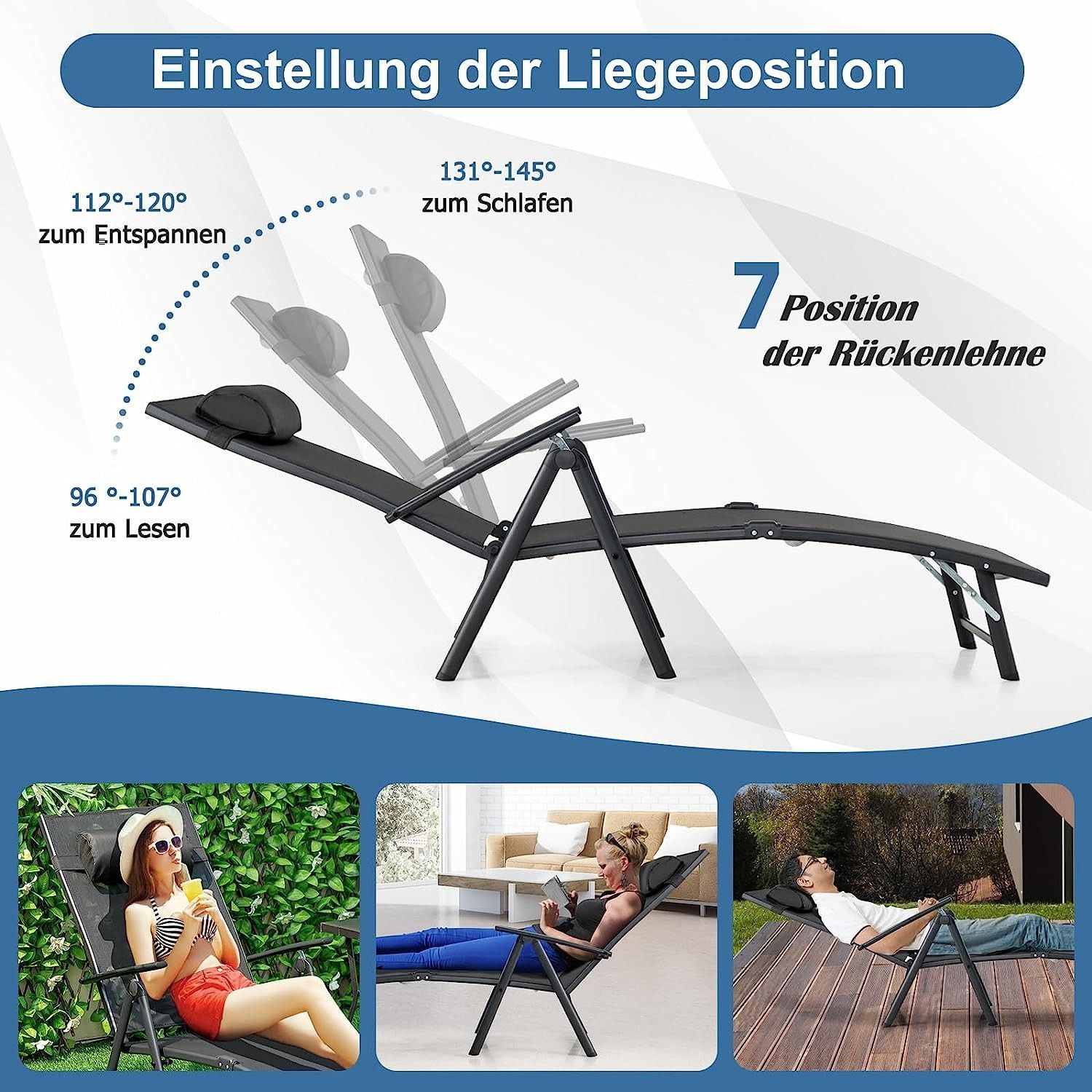 Sonnenliege klappbar, Gartenliege mit Kopfstütze, 7 verstellbaren Rückenlehnen