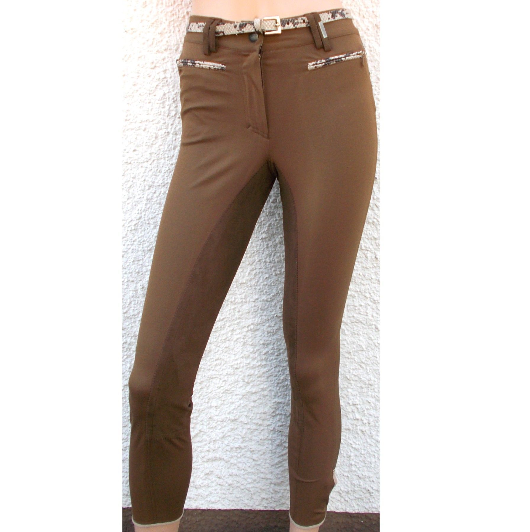 Sonnenreiter Reithose Snake in braun · Stiefelreithose mit Vollbesatz · strapazierfähig · atmungsaktiv · hoher Tragekomfort · Bund mit Gürtel und Gürtelschlaufen · Vorne zwei Reißverschlusstaschen · Applikation an den Taschen · rechts und links