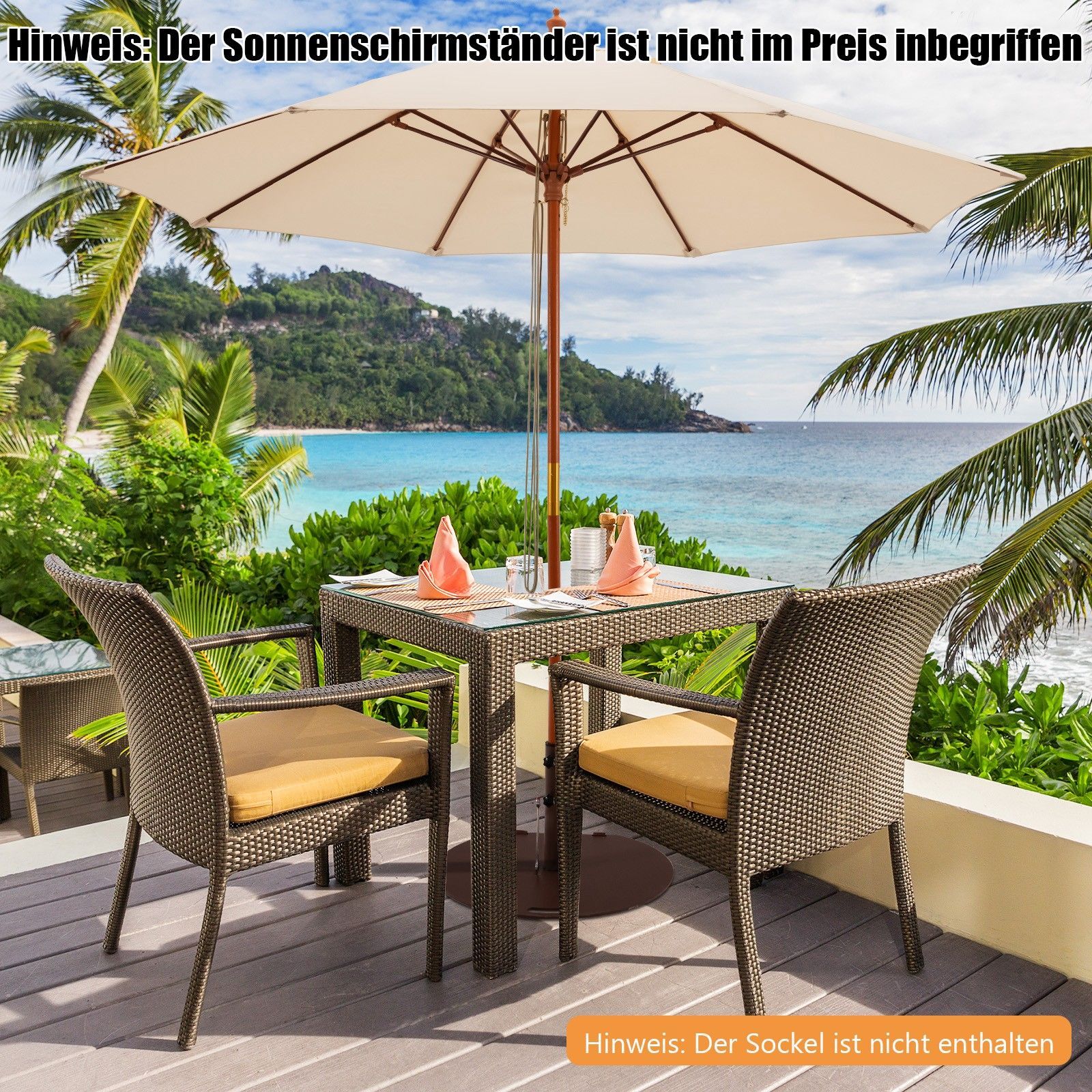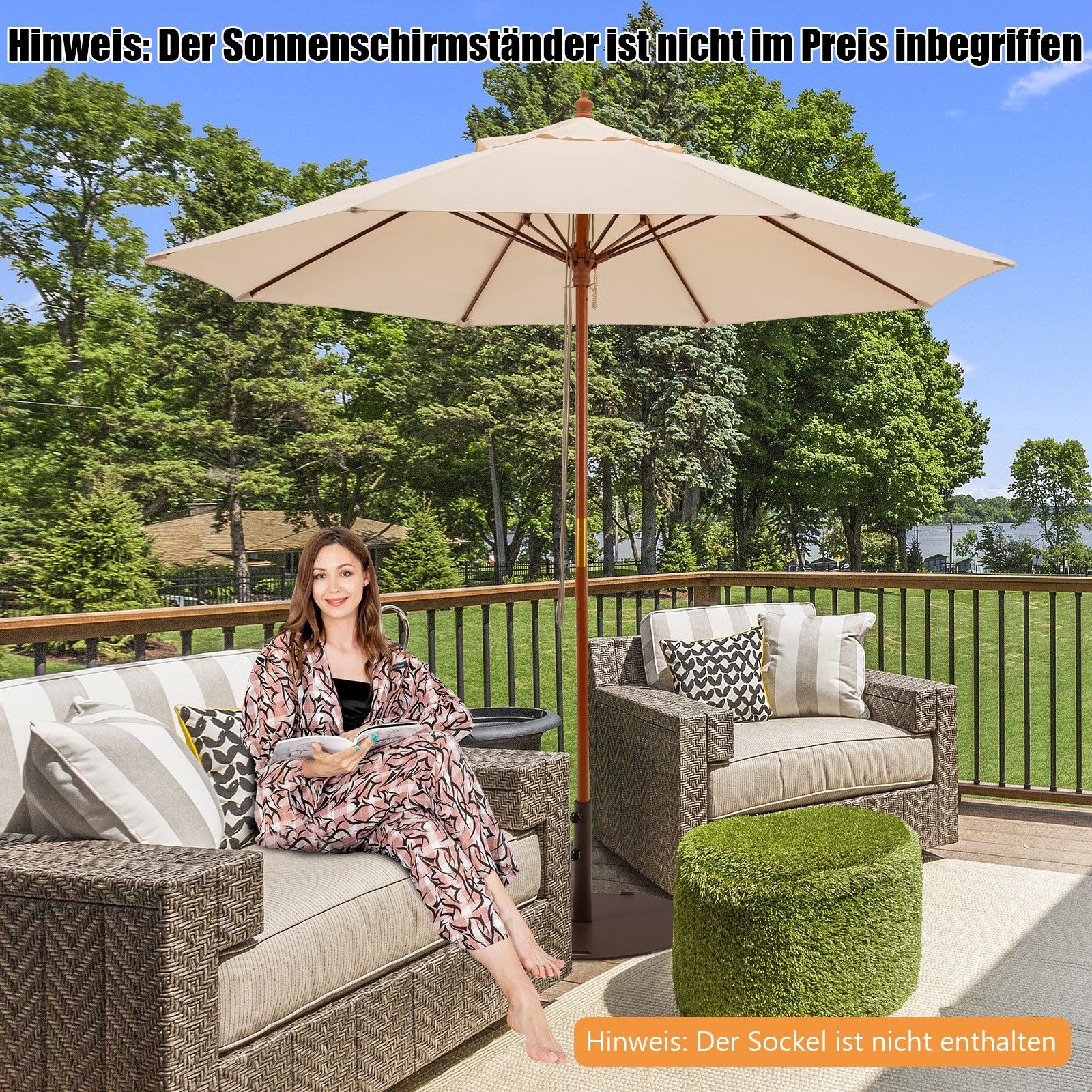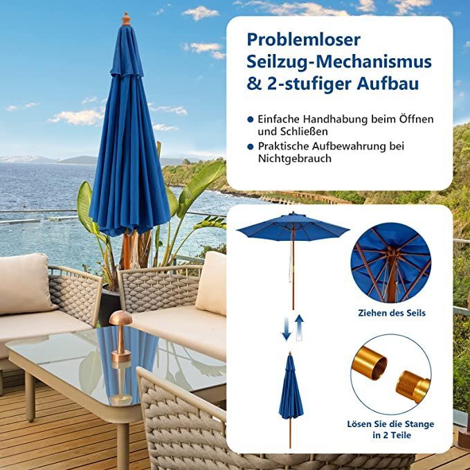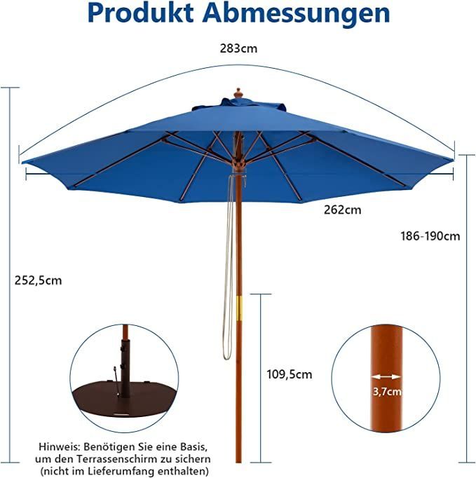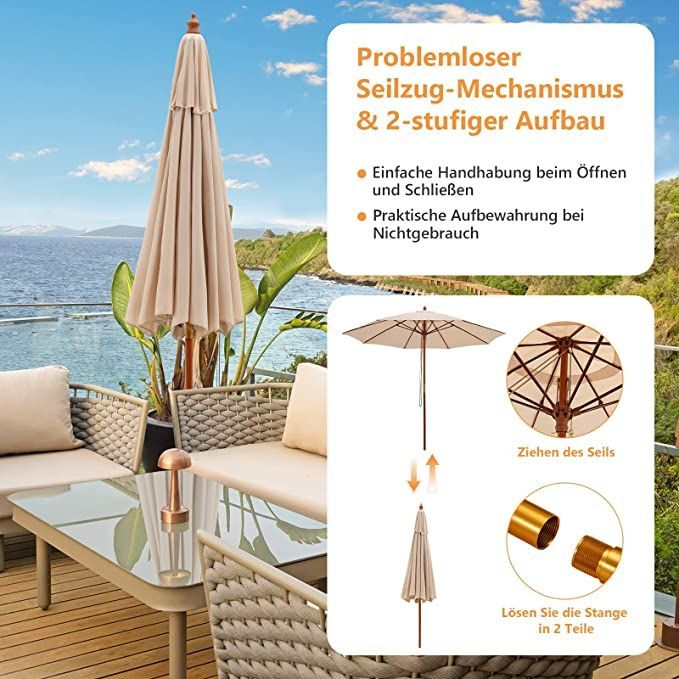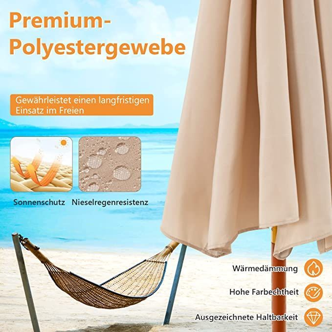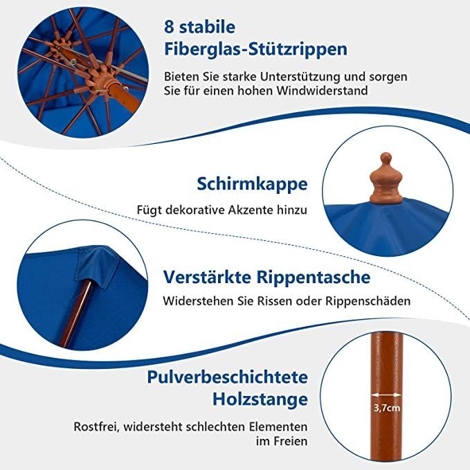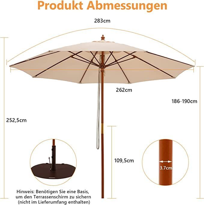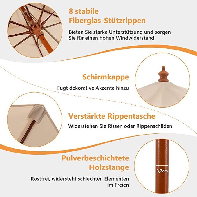 Sonnenschirm 260 cm, Gartenschirm Holz, Marktschirm Terrassenschirm für Garten