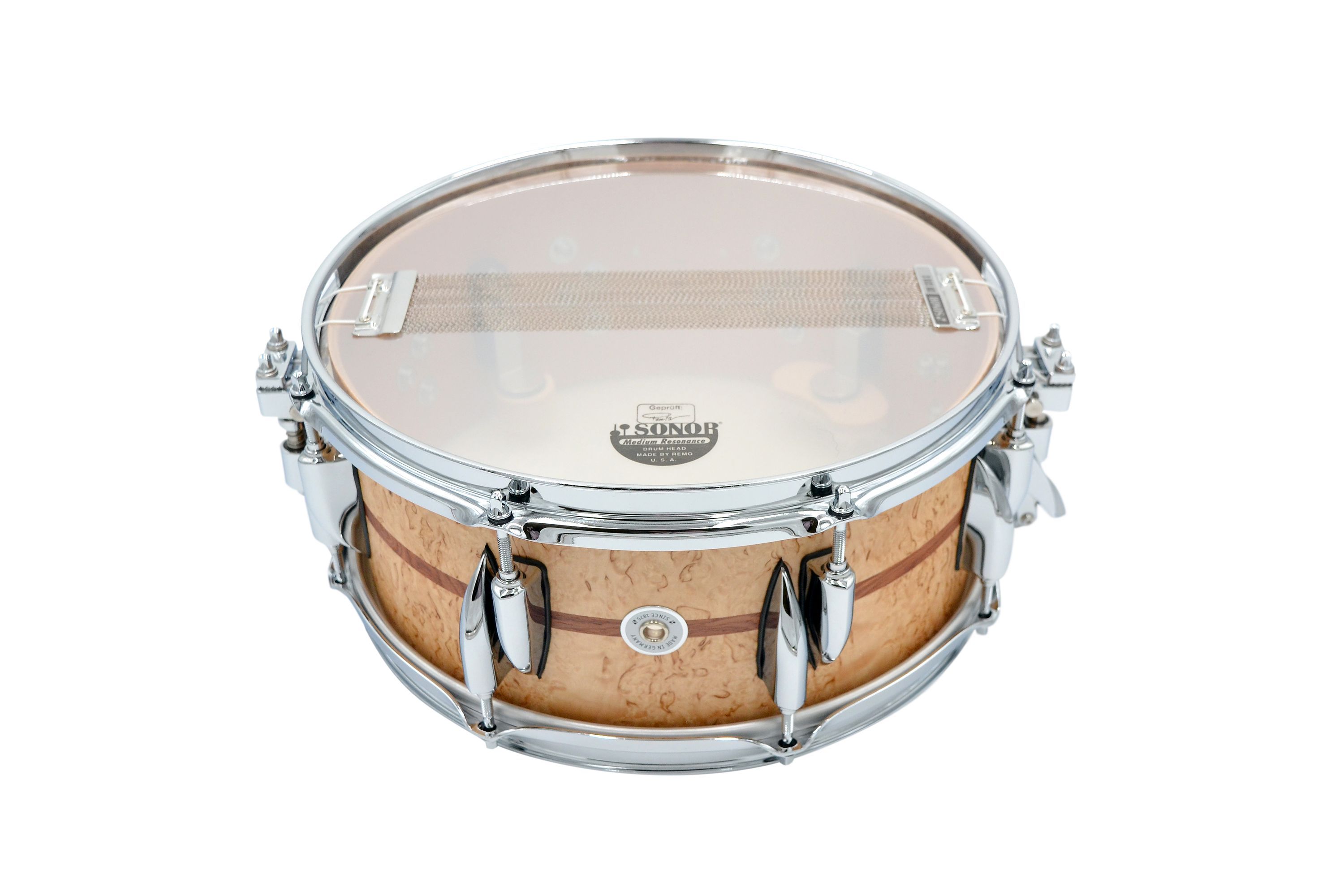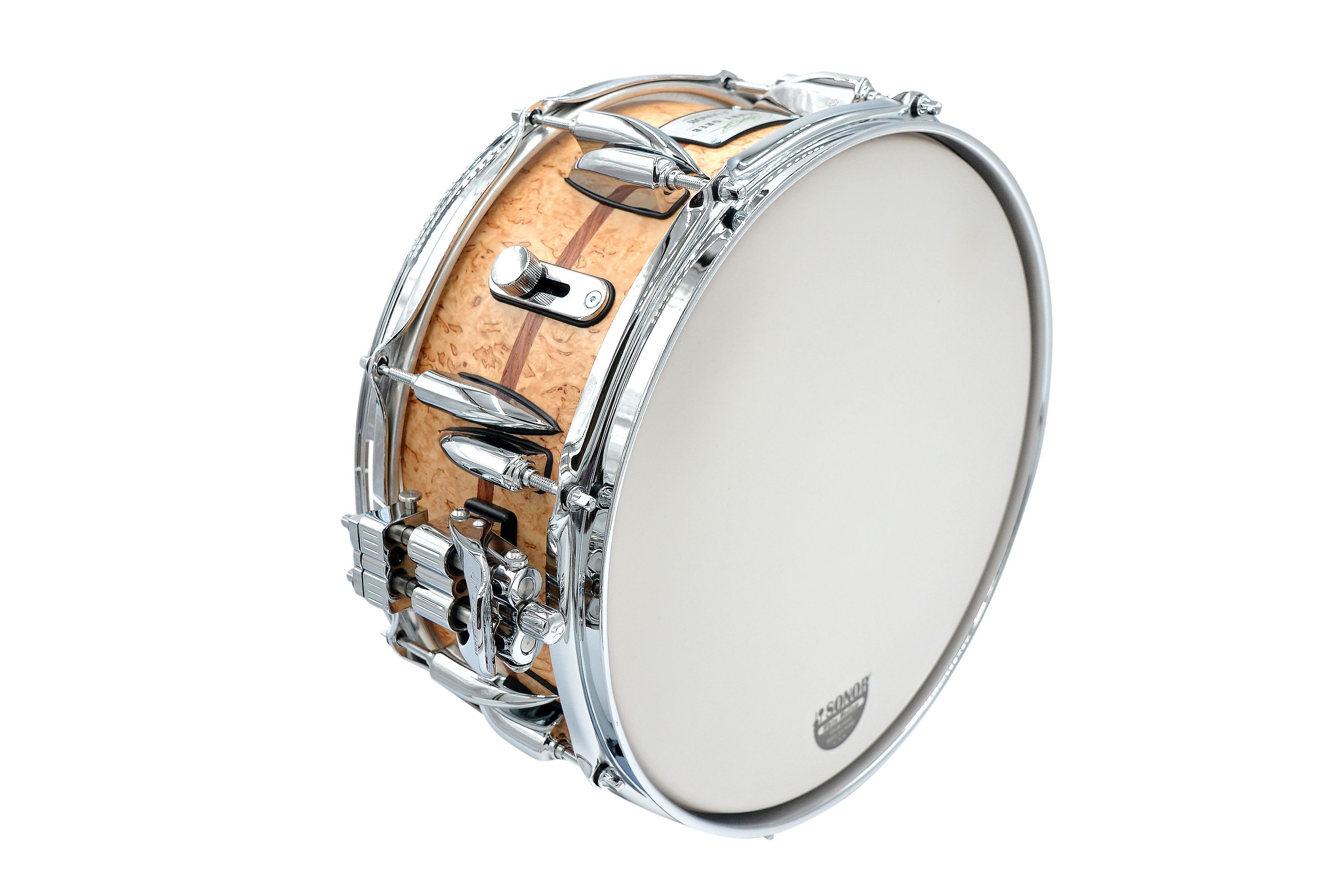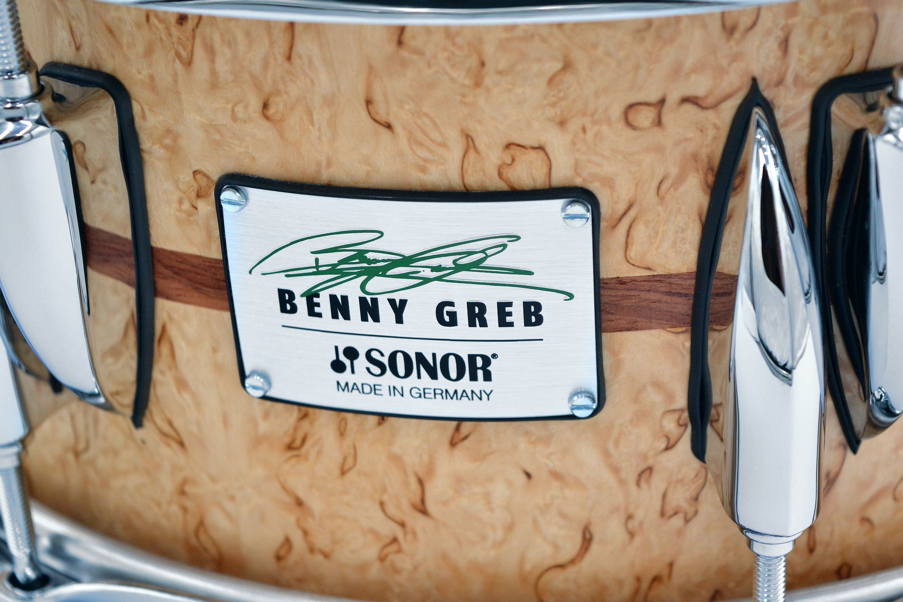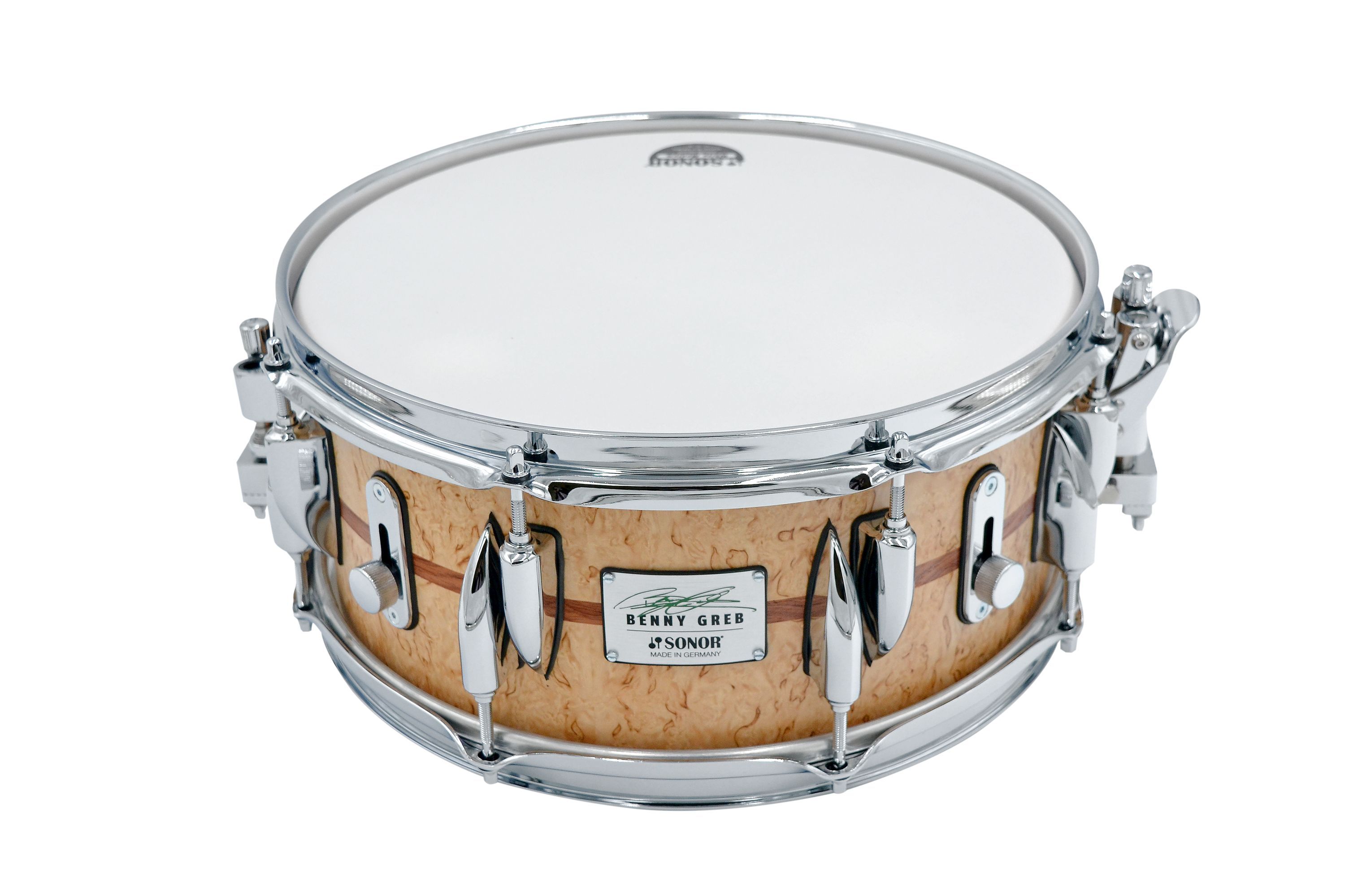 Sonor Benny Greb Signature Snare 2.0 - Buche Größe: 13'' x 5,75'' Benny Greb Signature-Modell 9-lagiger, 5 mm Buchenkessel Chrom-Hardware Vintage Spannböckchen Dual-Glide-Snareabhebung 2,3 mm Power-Hoops 18-spiraliger Stahlteppich Finish: seidenmattes Scandinavian-Birch-Furnier mit zentrierter 'Bubi
