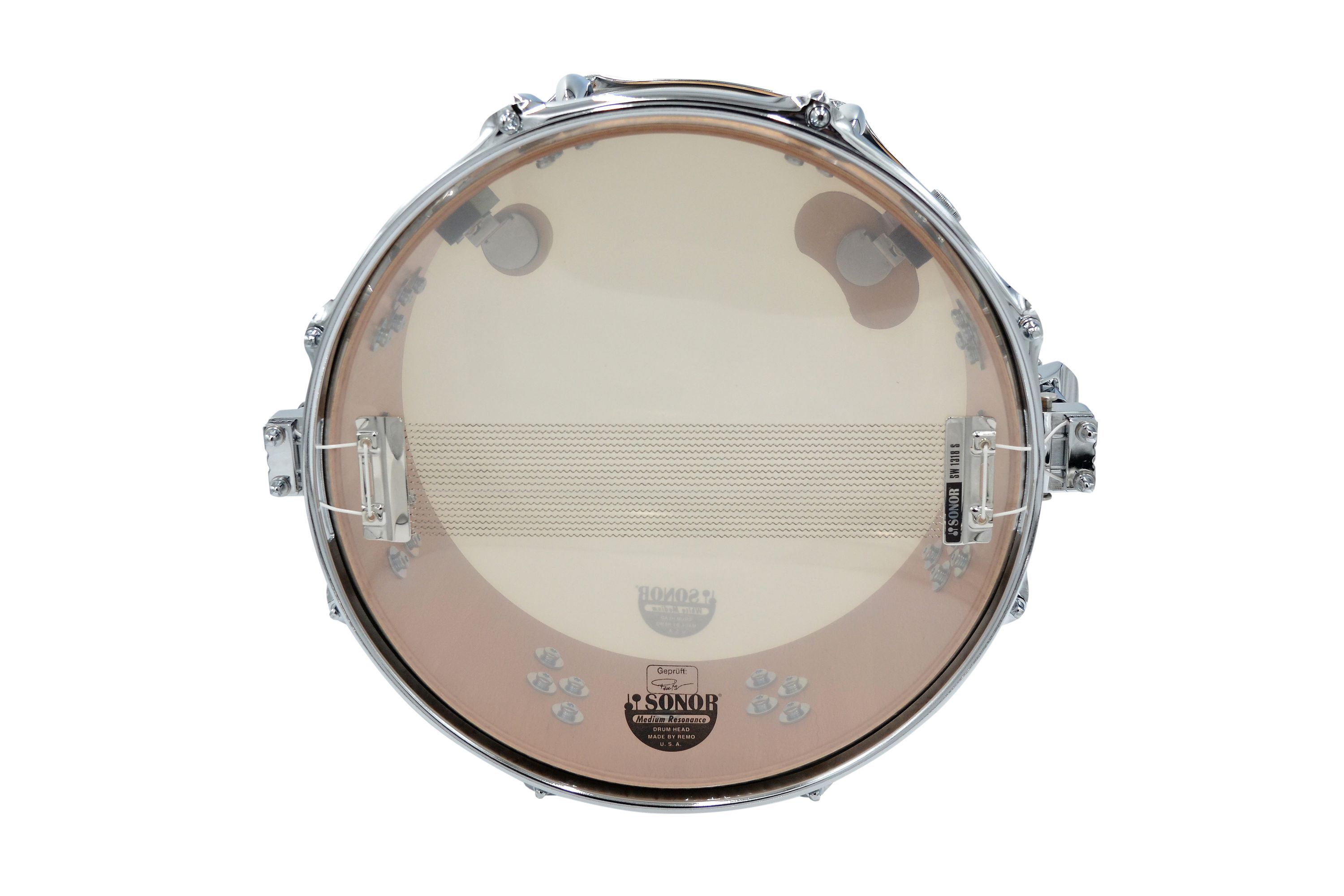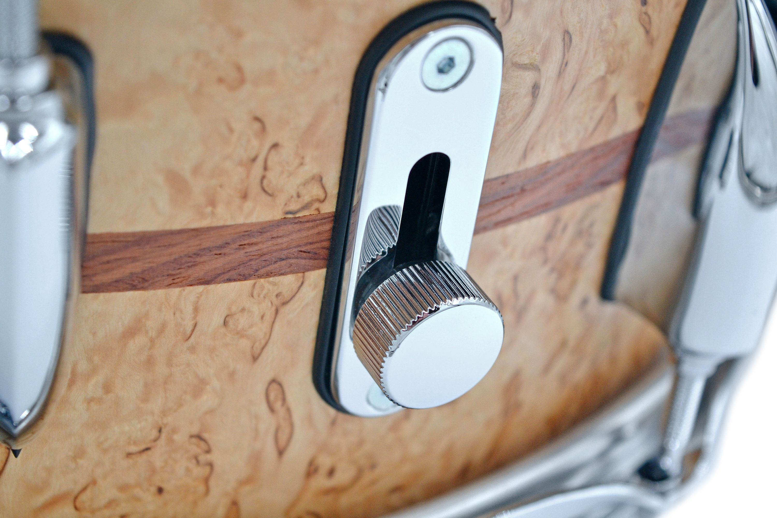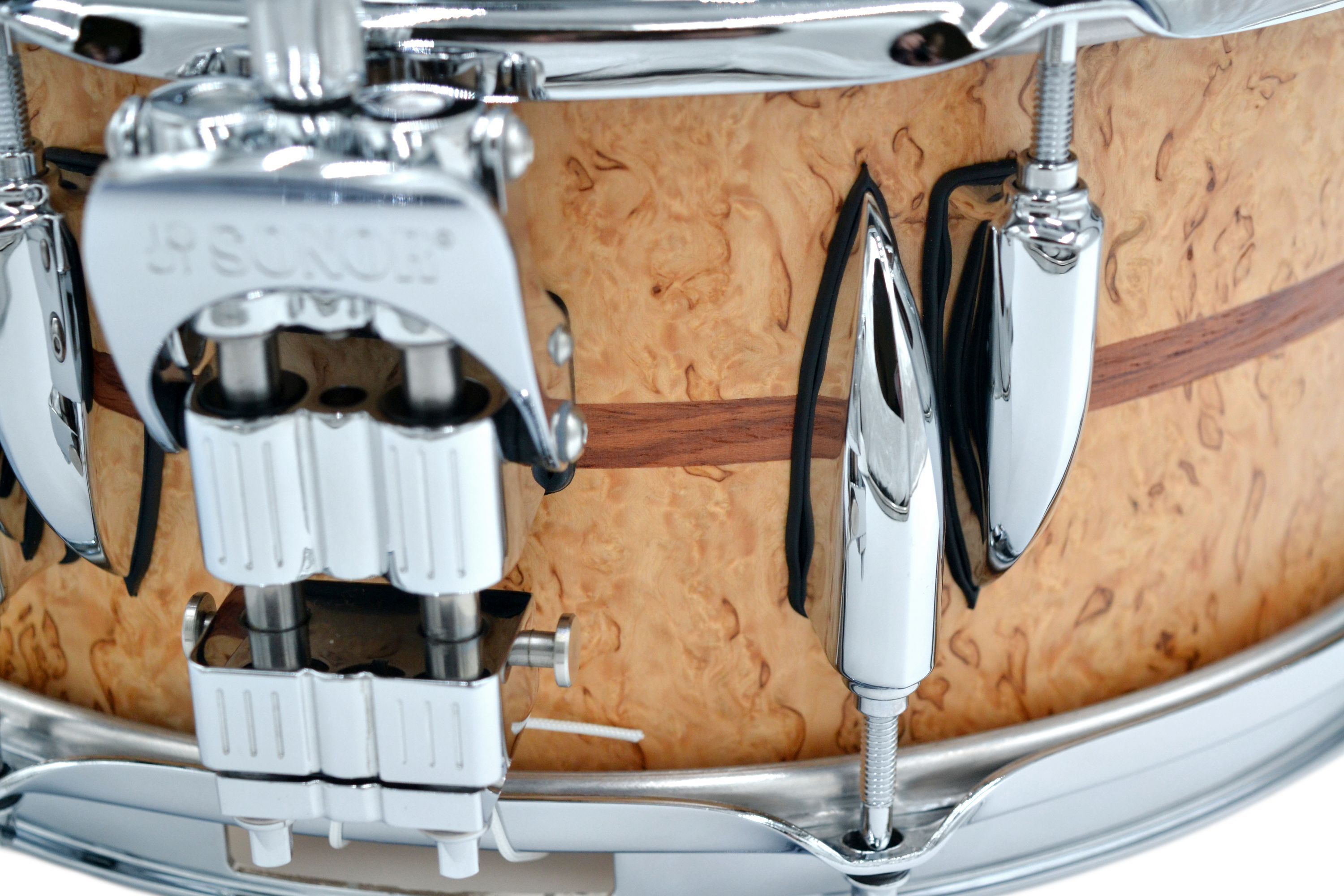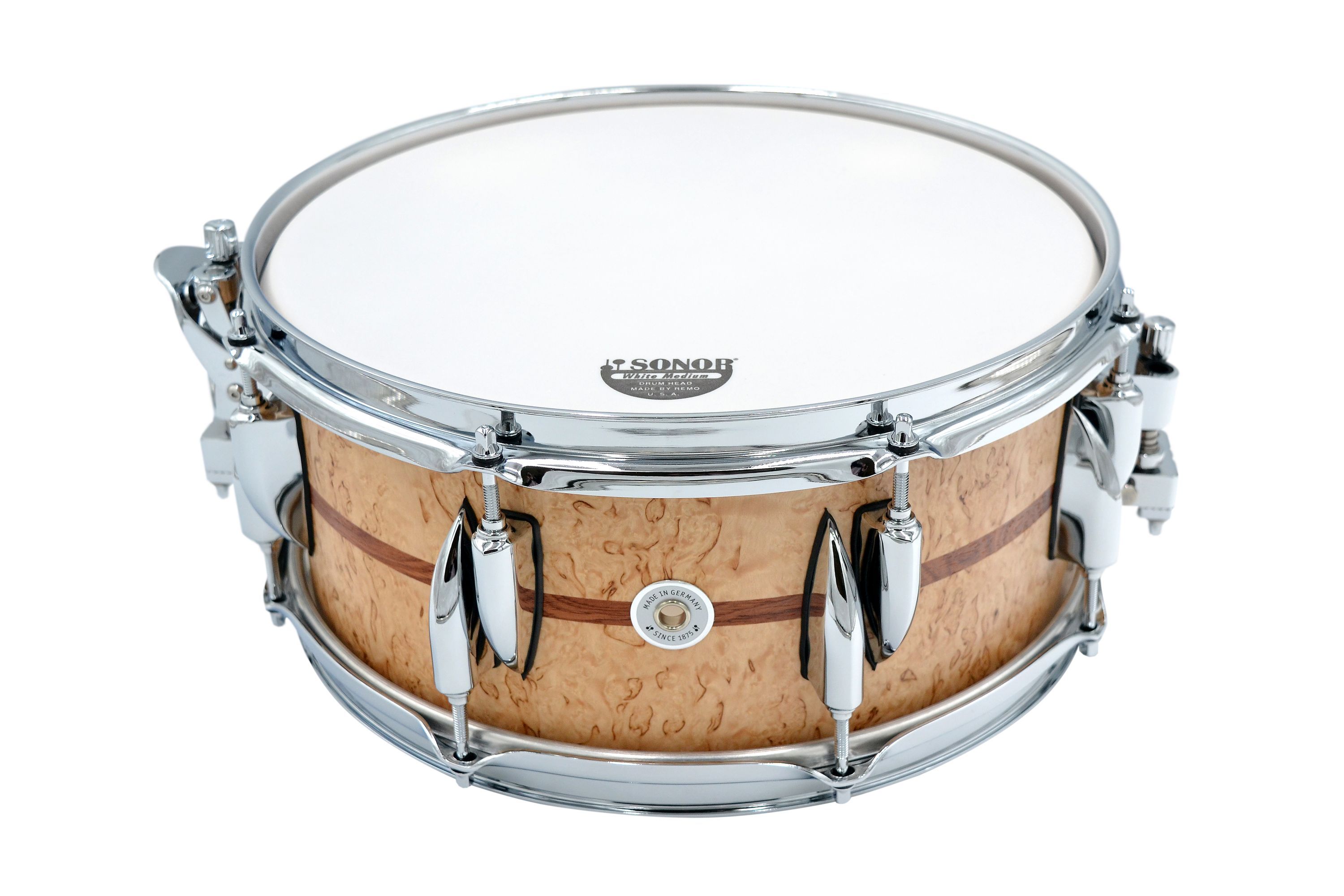 Sonor Benny Greb Signature Snare 2.0 - Buche Größe: 13'' x 5,75'' Benny Greb Signature-Modell 9-lagiger, 5 mm Buchenkessel Chrom-Hardware Vintage Spannböckchen Dual-Glide-Snareabhebung 2,3 mm Power-Hoops 18-spiraliger Stahlteppich Finish: seidenmattes Scandinavian-Birch-Furnier mit zentrierter 'Bubi