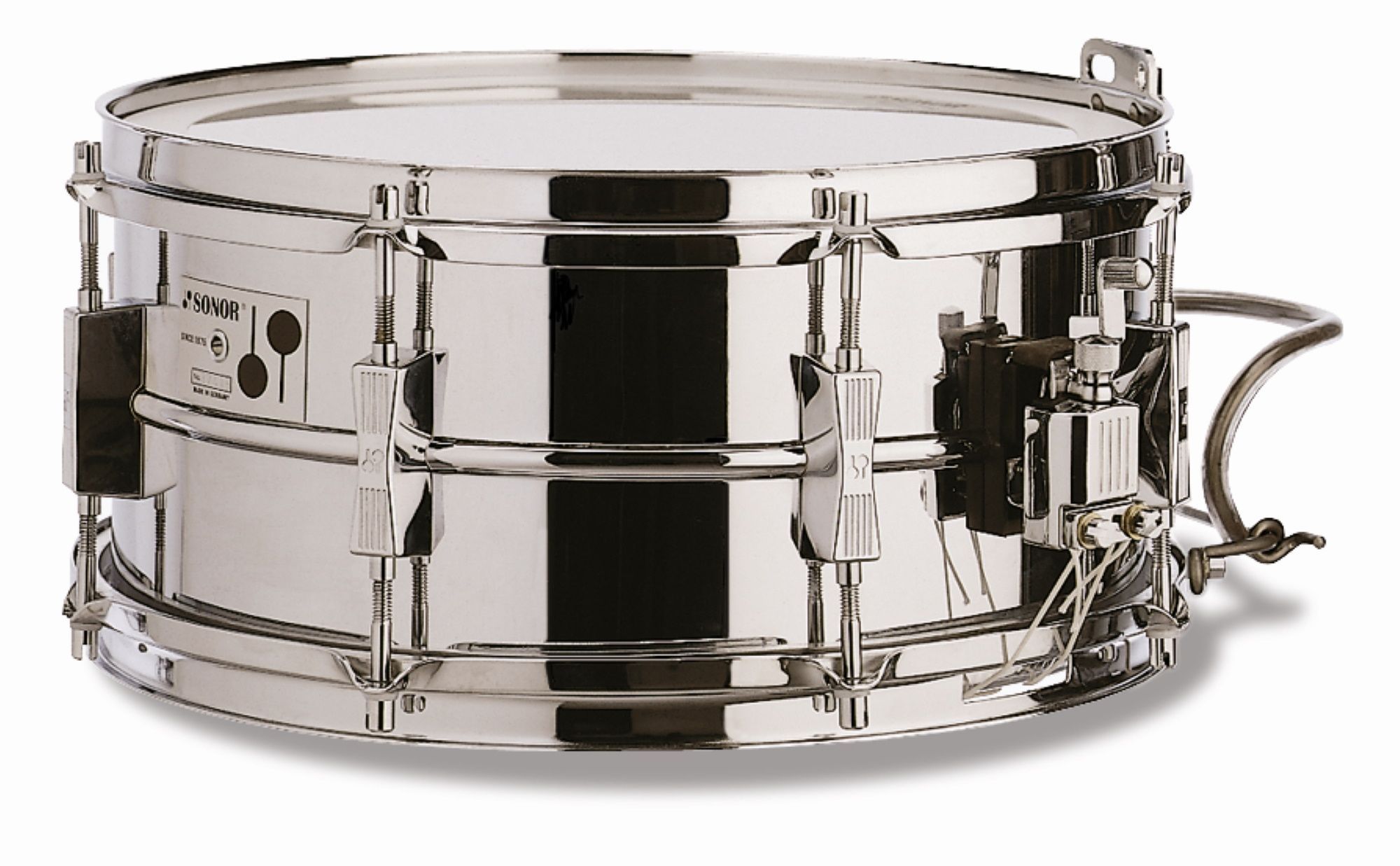 Sonor MP 456 14'x 6,5' Stahl verchromt Maße: 14'x6,5'' Gewicht: 4,6 kg Felle: einschichtig, weiß glatt, medium (made by REMO) 16 Spannschrauben Trageplatte Kniebügel ZM 6514 inkl. REMO Ringdämpfer (Muffl) Kessel: Stahl, verchromt Die SONOR Professional Line setzt Qualitätsmaßstäbe für höchste Ansprü