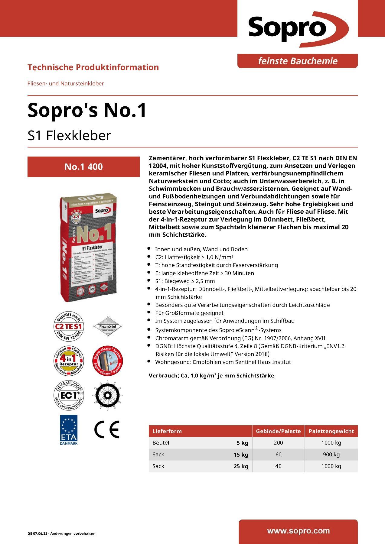 Sopro No.1 400 Flexkleber Fliesenkleber Natursteinkleber C2TE S1 grau 25 kg