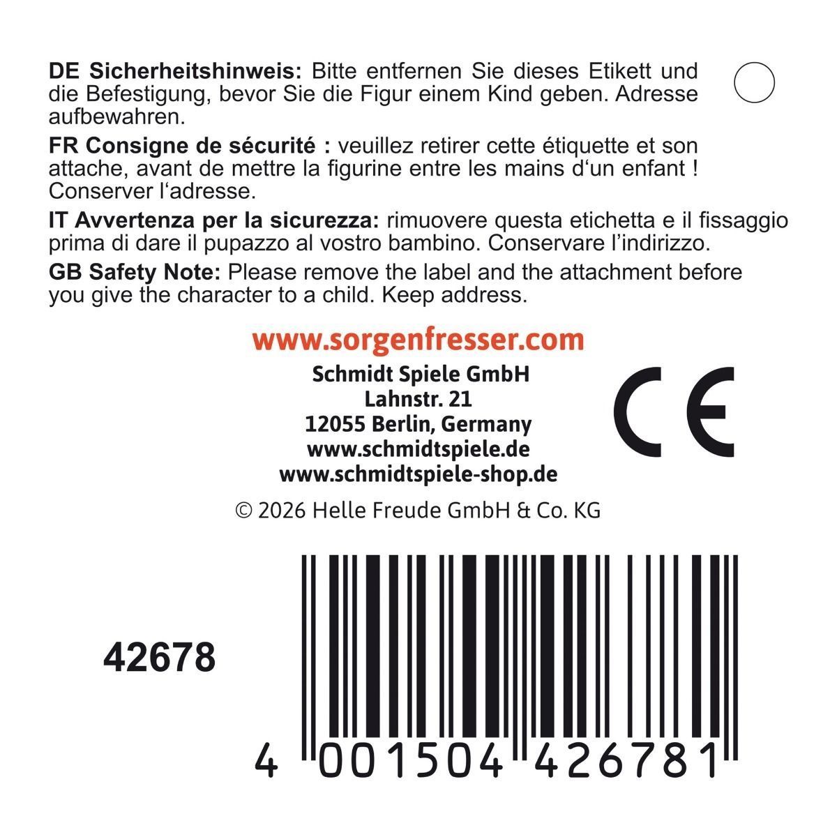 • Bitte entfernen Sie das Etikett und die Befestigung, bevor Sie den Artikel einem Kind geben.