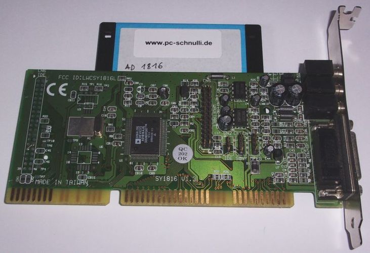 Mediatek SY1816 Hersteller: Mediatek Modell: SY1816 Chip: AD 1816 Slot: ISA Treiber: Auf Diskette für Win 9x, XP oder per download von meiner Homepage Funktionstest: OK Sonstiges: - Lieferumfang: Soundkarte, Diskette Karte wurde kurz auf Funktion mit Windows 98se getestet. Keine Garantie auf 100 %ti