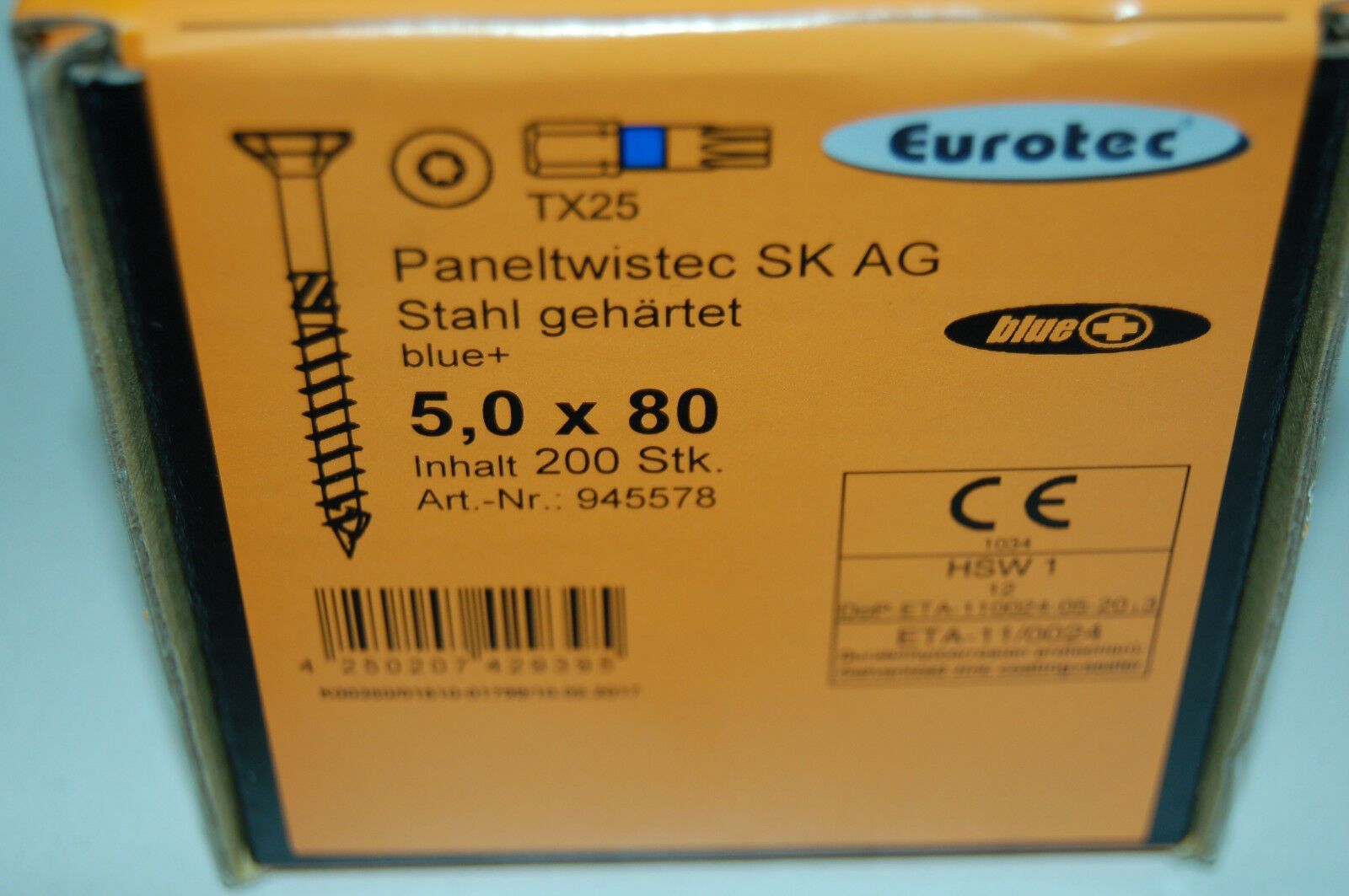 200 500 1000 Stück Spanplattenschrauben Paneltwistec AG von Eurotec blue+ verzinkt mit Senkkopf, Reibgewinde am Schaft und Fräsrippen unter dem Schraubenkopf Schraubenspitze AG Torxantrieb T20 Teilgewinde ETA-Zulassung ETA-11 0024 Korrosionsschutz blue+ ist ein innovatives Beschichtungssystem mit ei