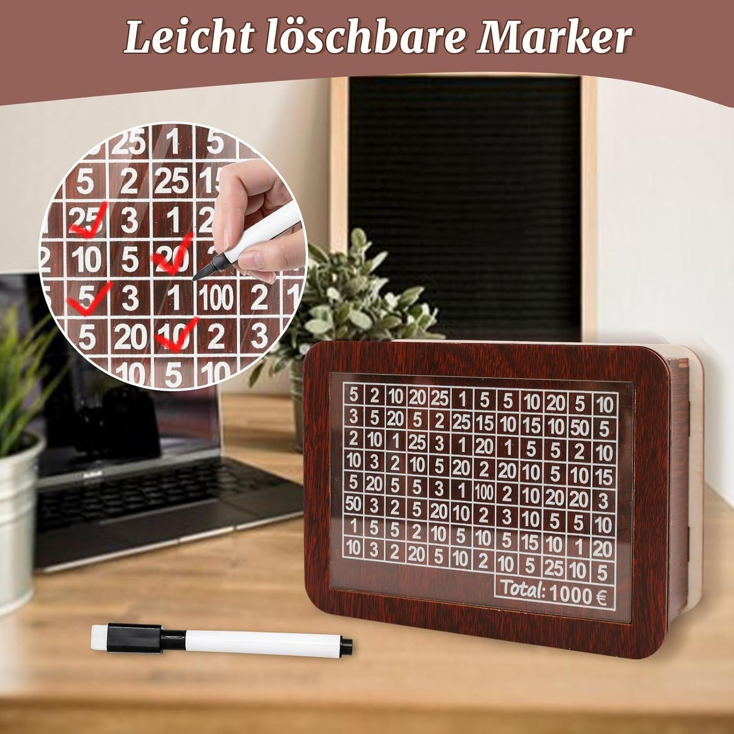Sparbox aus Holz mit Zahlen zum Ankreuzen mit Sparziel 1000€, 2000 € und 3000 €