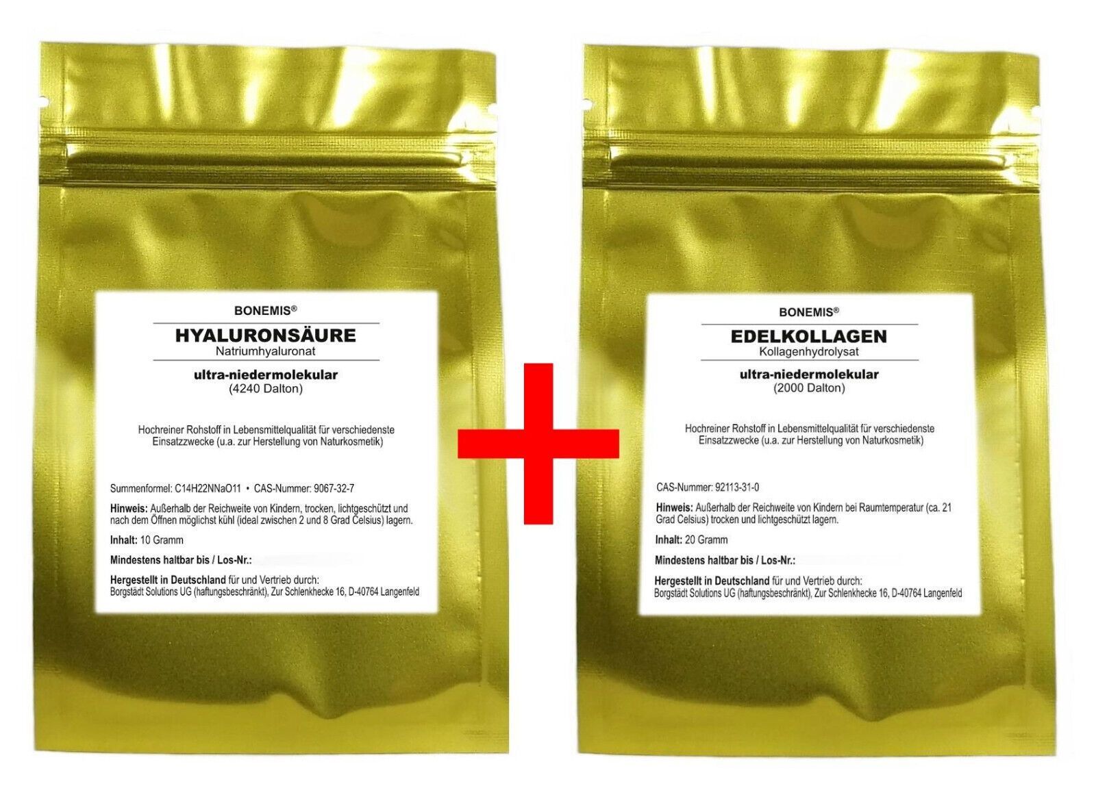 Sparbundle unserer beliebten Rohstoffe Hyaluron + Edelkollagen (Anti-Aging-Creme selber machen). Bonemis® Hyaluron (Anti-Aging-Creme selber machen), Rohstoff für Naturkosmetik, 10 g im Beutel Hochwertige, ultra-niedermolekulare Hyaluronsäure in Pulverform (3 bis 5 kDa = 3000 bis 5000 Dalton). 10 g i