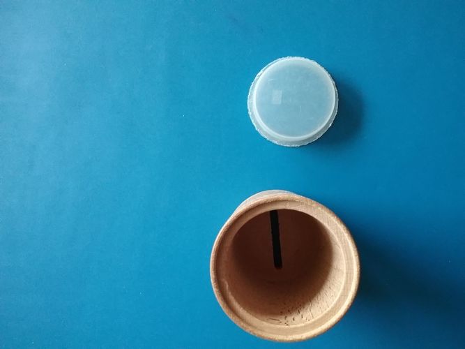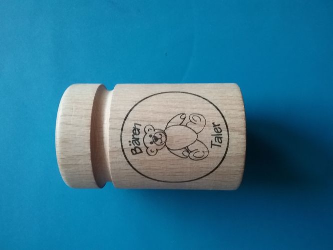Holzdose als Spardose. Zylimderform. Schlitz oben. Plastikdeckel unten. Motiv: Bären Taler 9 Teddybär. Größe siehe oben. Privatverkauf. Sie erhalten genau die abgebildete Dose