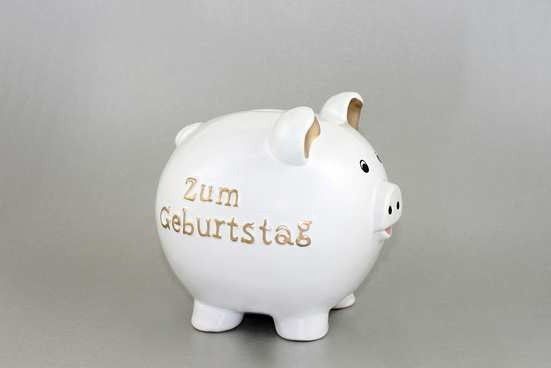 Sparschwein "Zum Geburtstag" weiß, Dolomit, mit Schloss - 3 Größen